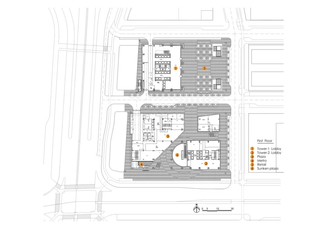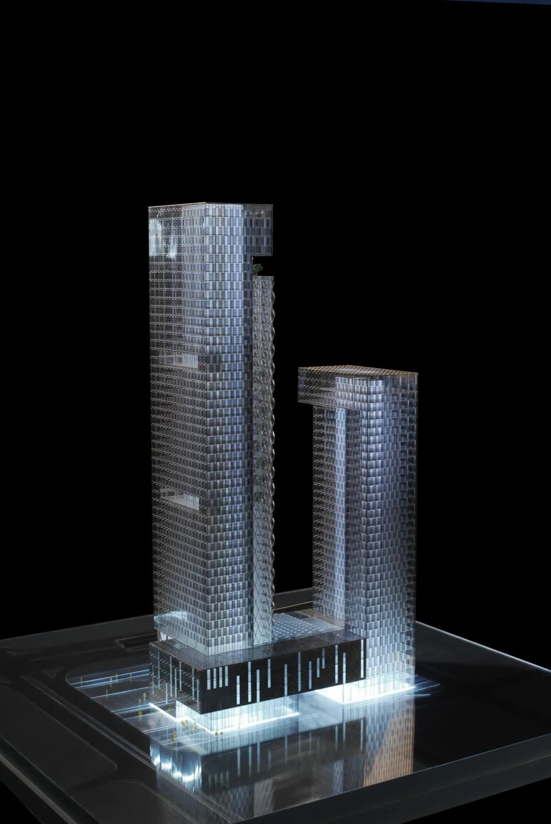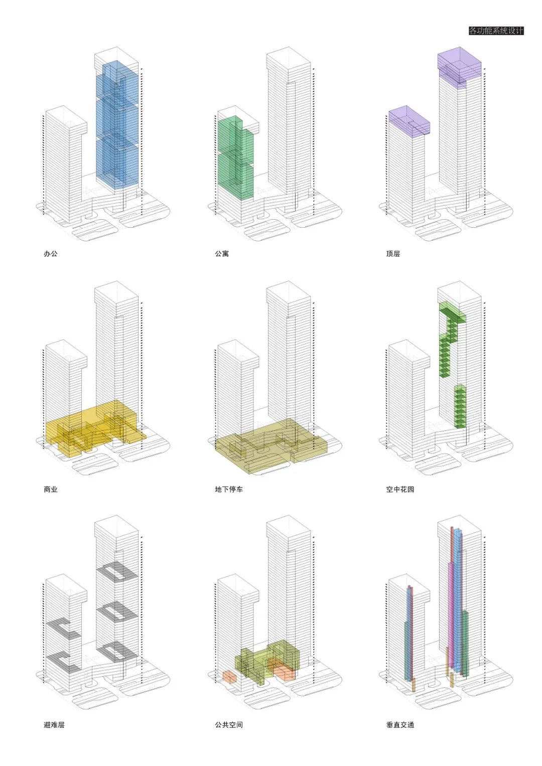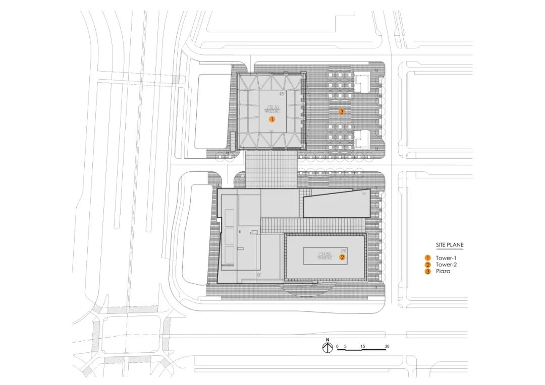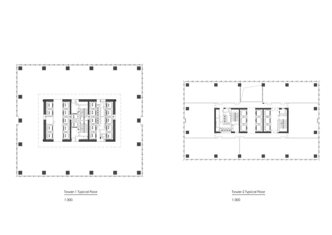 由于地块比较狭小,相邻的两栋高层塔楼布局会存在对视问题,针对地块特点和平面功能要求,我们采取塔楼错位布置的布局方式,拉开塔楼间距,争取更好的视野。北面塔楼核心筒偏置,减少对视干扰。群楼部分利用东、南临街界面组织商业空间,最大限度发挥地块优势。