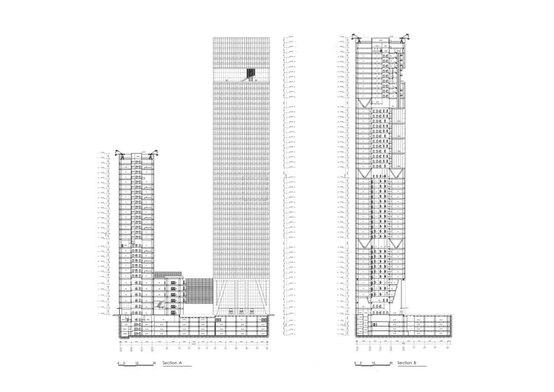 建筑师从一开始就设定了目标,必须让建筑的底层空间呈现出开放的状态,减少裙房大进深带来的封闭感。建筑师利用核心筒居中,商铺包外边的手法将外铺价值最大化,成功消解地块内道路对商业街延续性的破坏,保证了沿海德三路,后海滨路黄金铺位的价值。六层高的裙房设置了斜向贯穿的架空通廊,下沉广场结合地铁出口,将人流直接带入商业核心部位,并引导向北侧1800平方米的公共广场。铺位沿通道展开,有效消化了商业进深。采光玻璃顶将阳光引入中庭,层层抬升的商业露台结合扶梯创造了多层次、连续的商业空间,赋予建筑鲜明的南方气候特征。