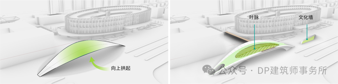 改造前后的六堡茶城交易中心及主入口大门暗香邀雅客,一叶香茗载知音。六堡茶属山茶科常绿灌木,叶子呈长椭圆披针形,青翠欲滴。主入口大门的设计灵感来自六堡茶的新茶之韵。一瓣被精心挑选的茶叶,在太阳照耀下微微向上拱起,形成轻盈飘逸的入口。