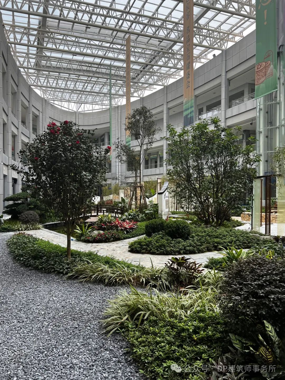 中庭空间从露天硬地、周边封窗的单一布局,优化为以六堡茶文化为主题的沉浸式展览馆。顶部调整为可电动开启的玻璃天幕,覆盖到的底部空间将作为全天候的开放式文化剧场,不仅能让自然光与清风在晴朗之日自由穿梭,沐浴整个茶城,更在风雨交加之时,确保中庭活动顺利举行。二三层区域更是全面开放,游客可从多个角度、多个高度,全方位地欣赏与体验这场精心策划的茶文化盛宴。