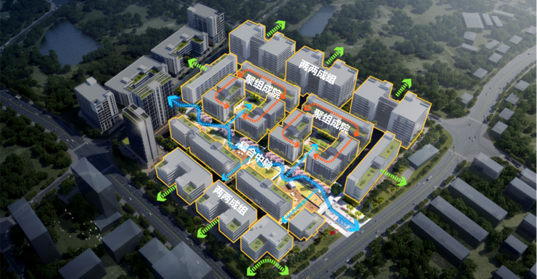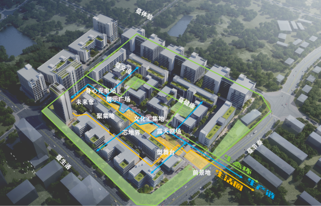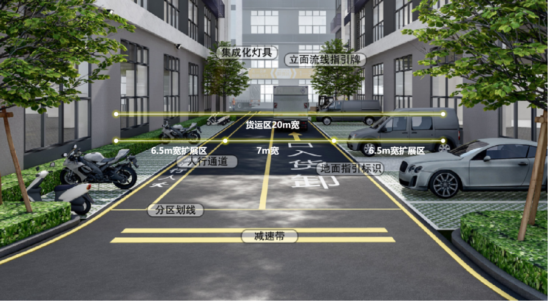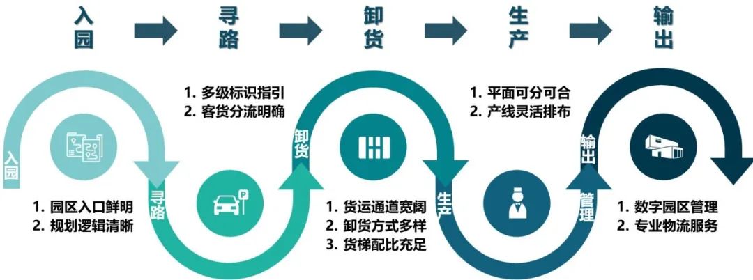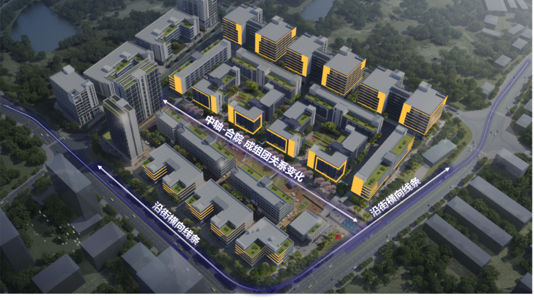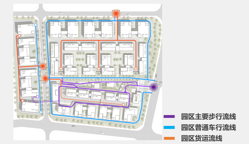 中央复合轴线为园区主要流线,将人流引入园区并扩散至各个组团。总体布局上严格将客、货分流,互不干扰,人流以最便捷、最舒适的方式到达建筑,两侧厂房共用货运通道,结合消防登高场地,高效通行。