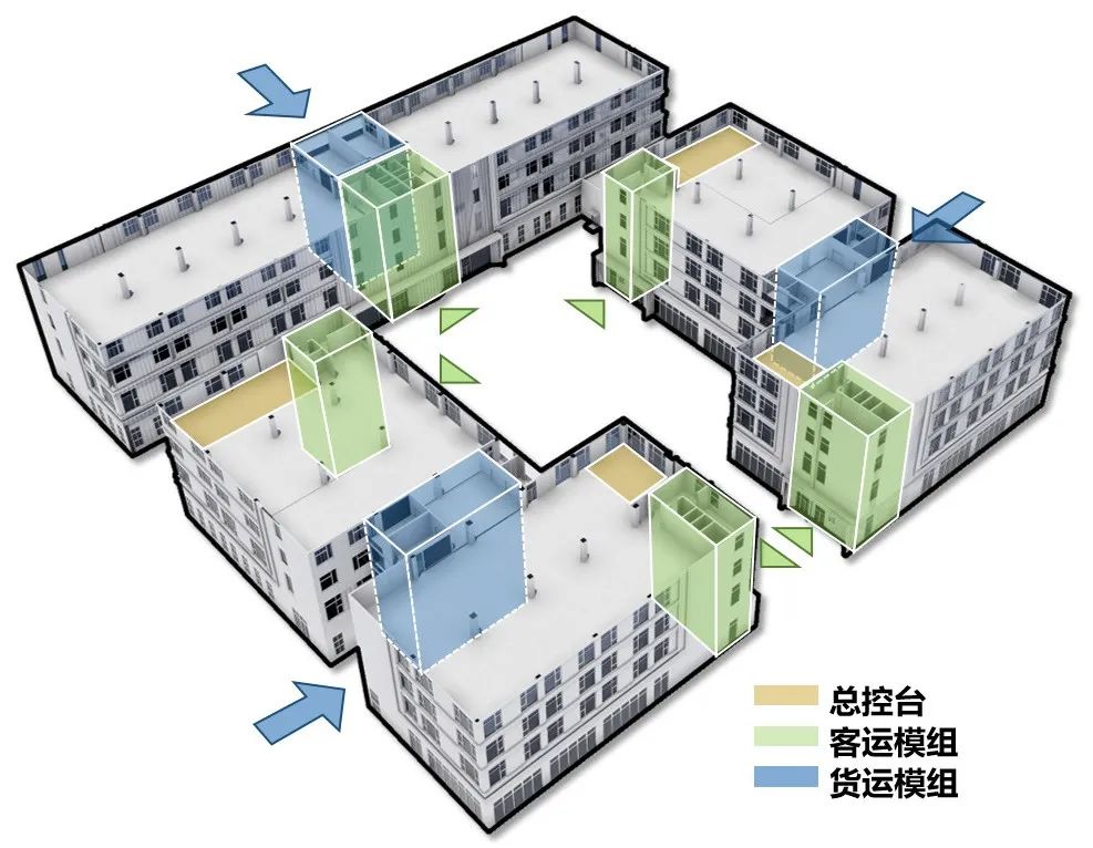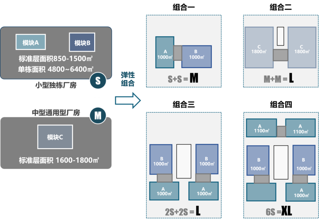 产业模块可进行灵活组合,客梯与货梯分离布置,流线上互不交叉,临近客梯位置可设置老板办公室、总控台等。