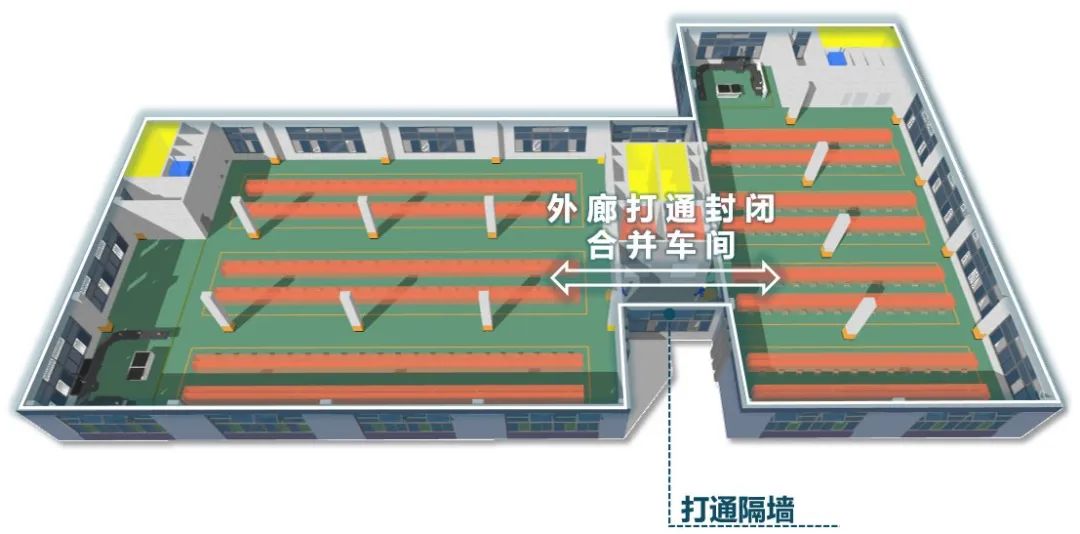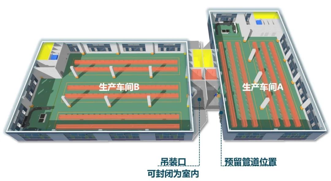 组合连接凹槽处设置外走廊(不计面积)卸货、吊装,后期企业可封闭为室内空间使用。凹槽空间为企业预留后期安装外挂管道位置,满足实用性的同时不影响外立面。