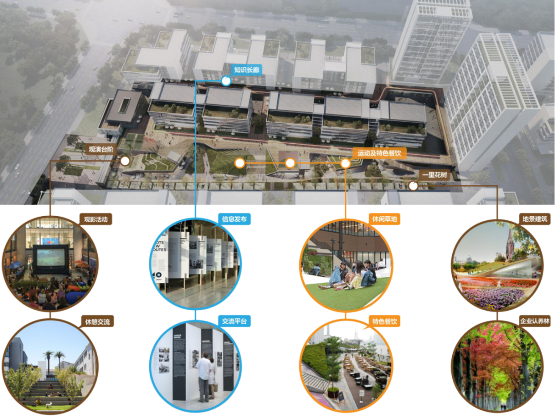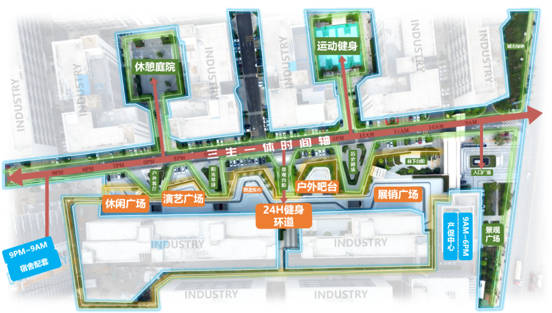 从工作到生活,从停车、餐饮、活动到住宿,园区为入驻企业提供全方位服务以及丰富多样的配套活动空间,打造立体产业小镇街区,为园区内所有使用者提供24小时贴心体验。