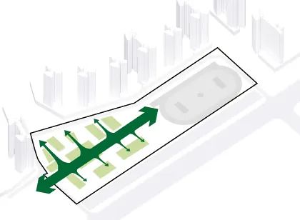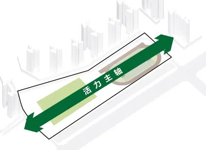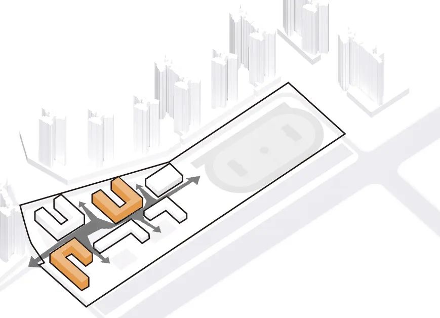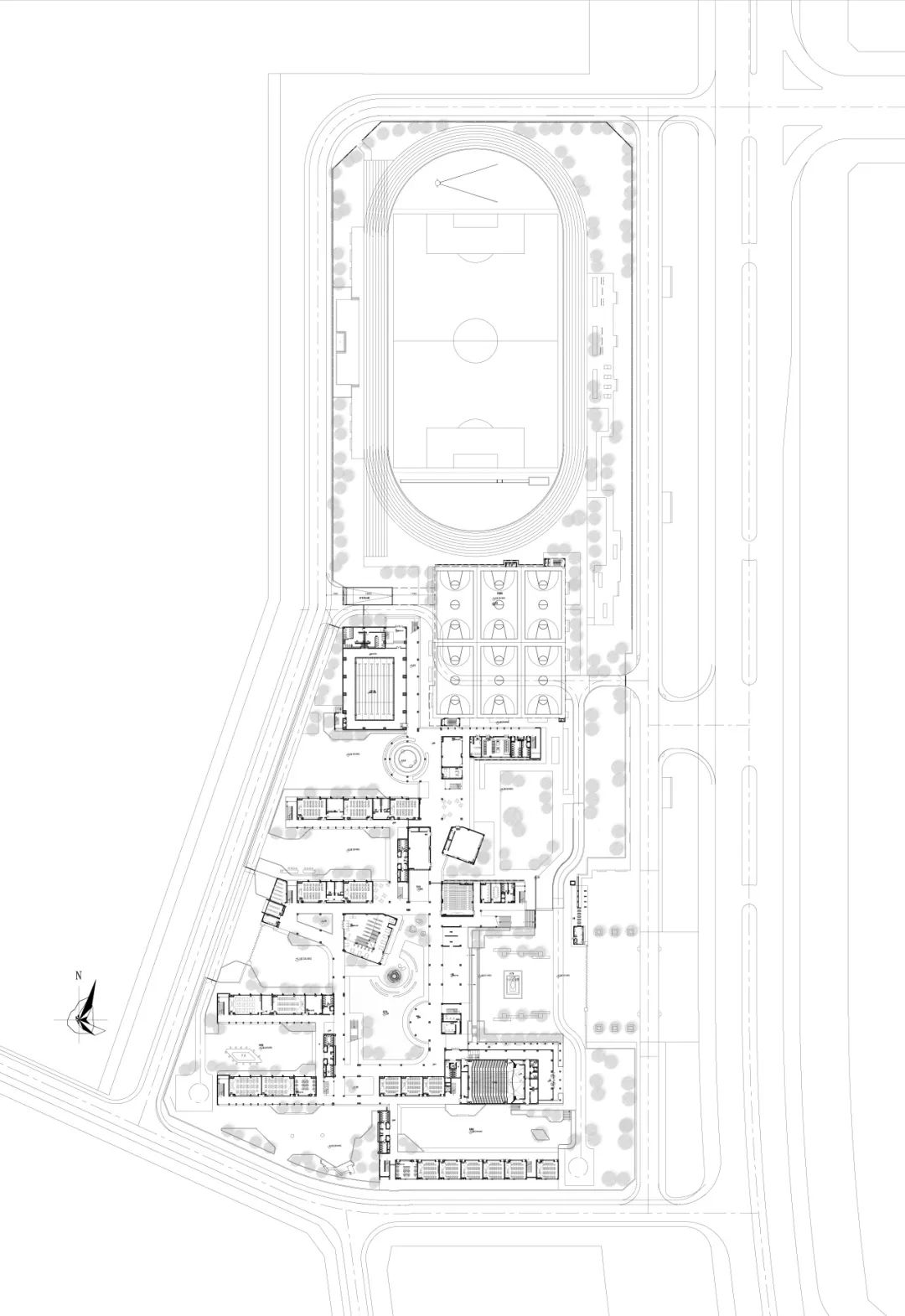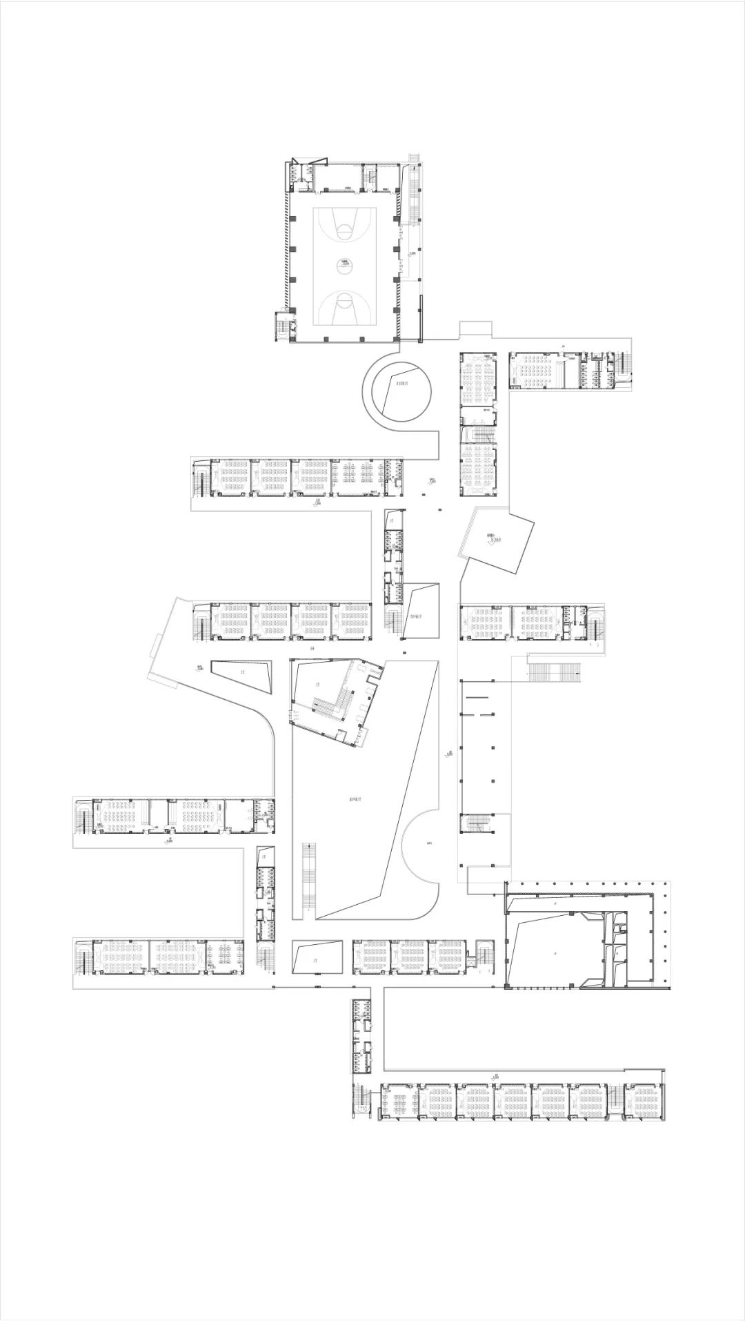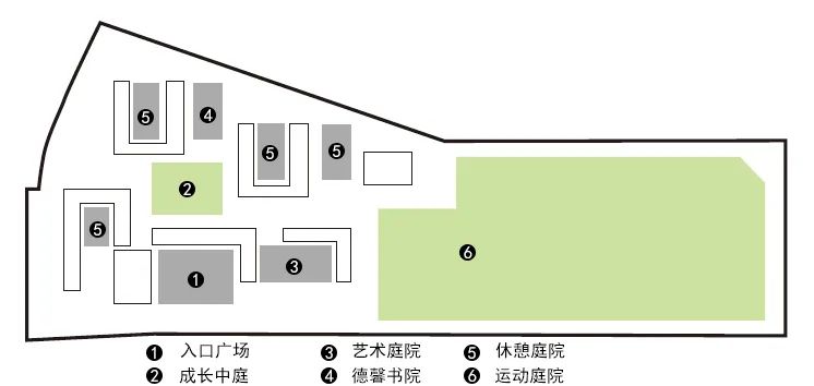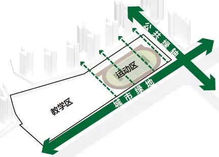 教学区与运动区是校园重要的两大组成各部分,在经过多方案对比,对片区规划仔细研究后,结合场地南宽北窄的特点,最终选择将教学区放在南侧,运动场放在北侧的方案,通过一条活力主轴连接,这便形成了基本的图底关系。