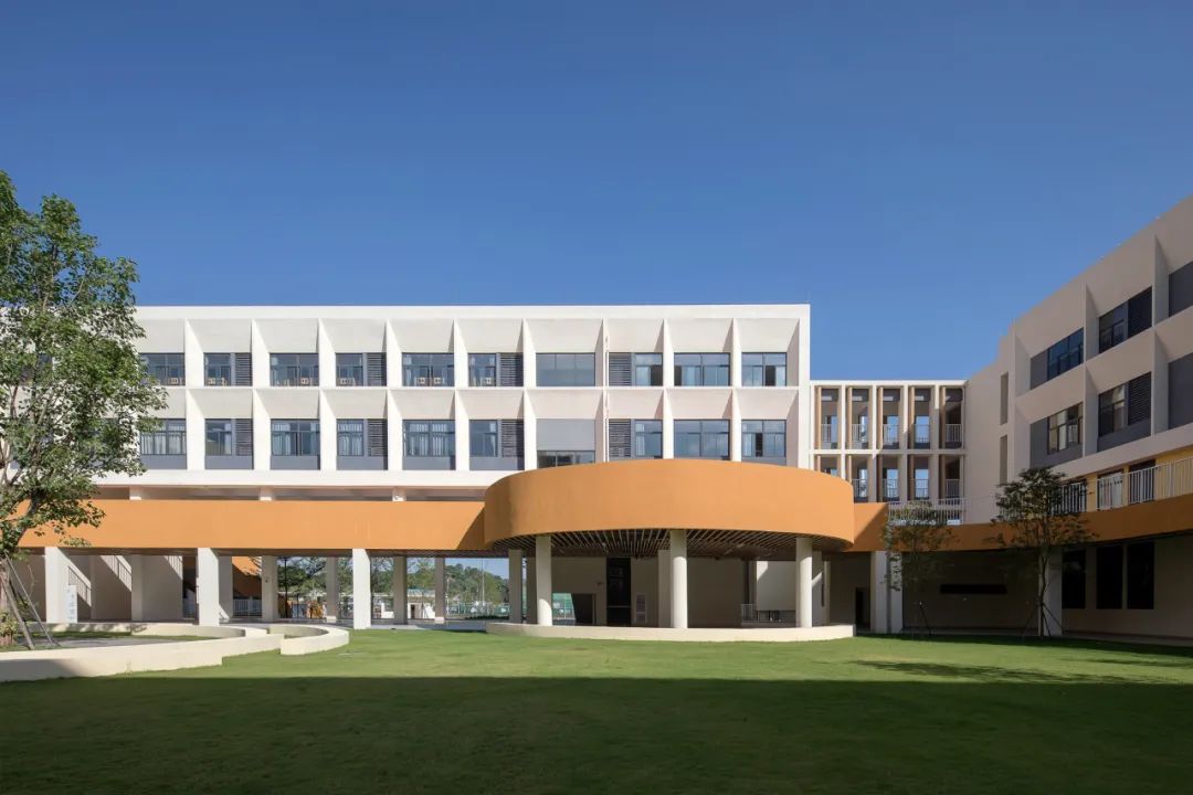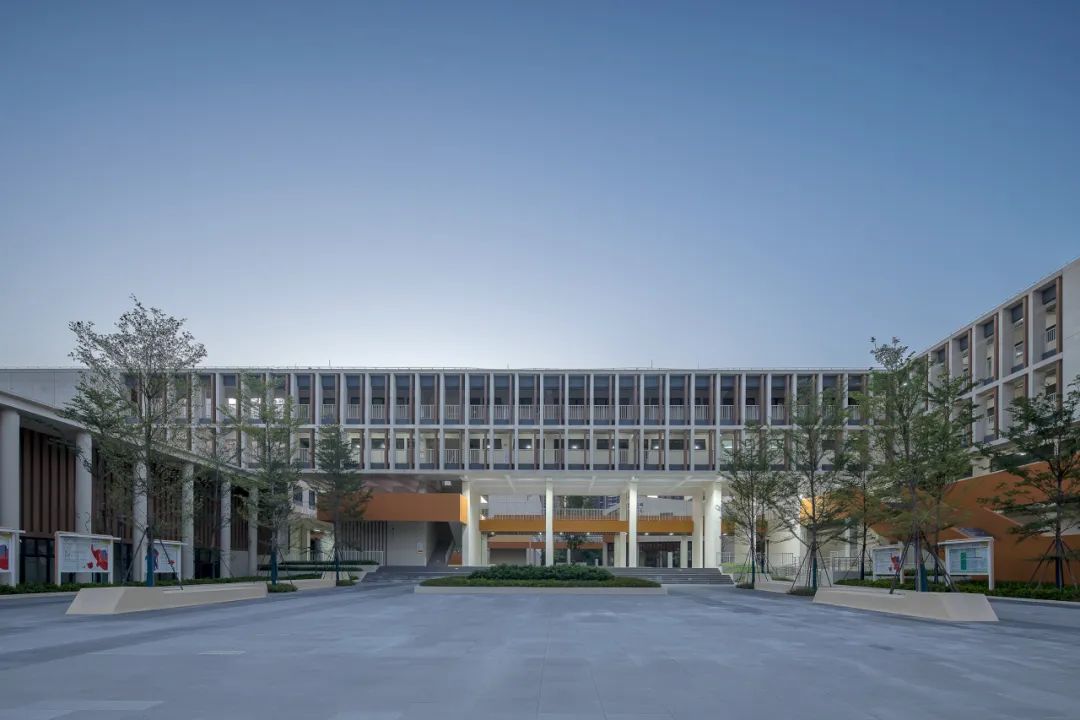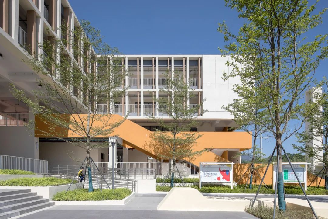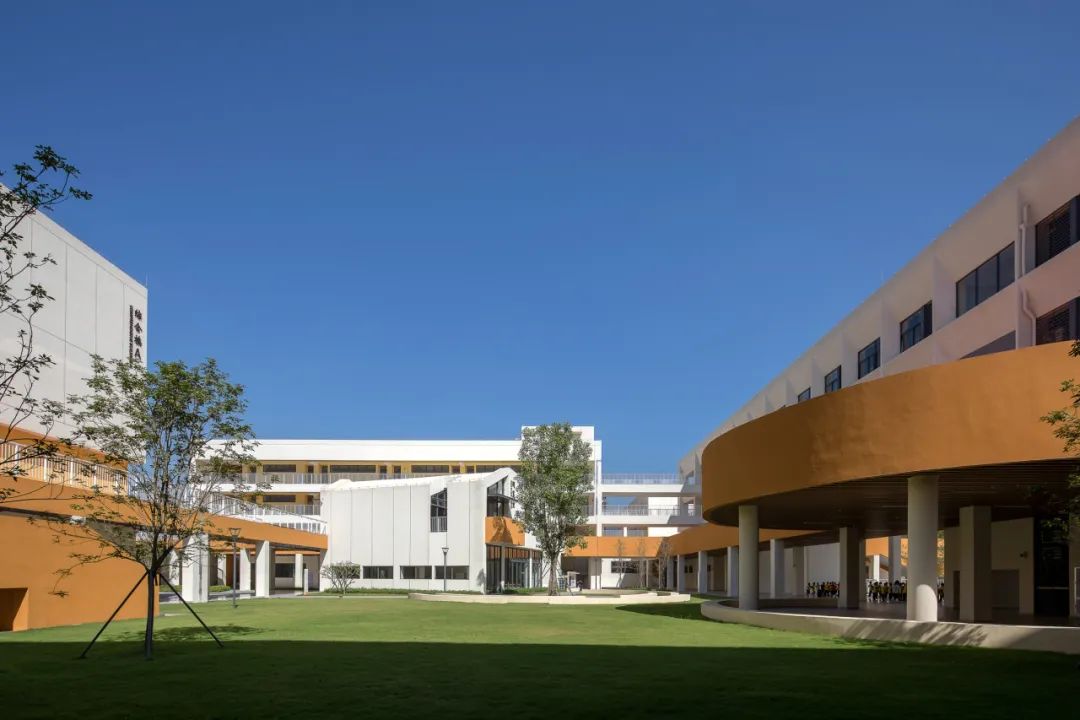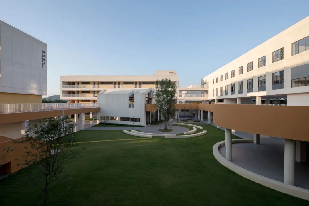 校园的主色调以白色、黄色、橙色以及深灰色为主,大面积采用黄色和橙色等鲜艳的色彩,旨在激发校园活力,创造一个积极向上,富有创造力的学习和成长空间。
