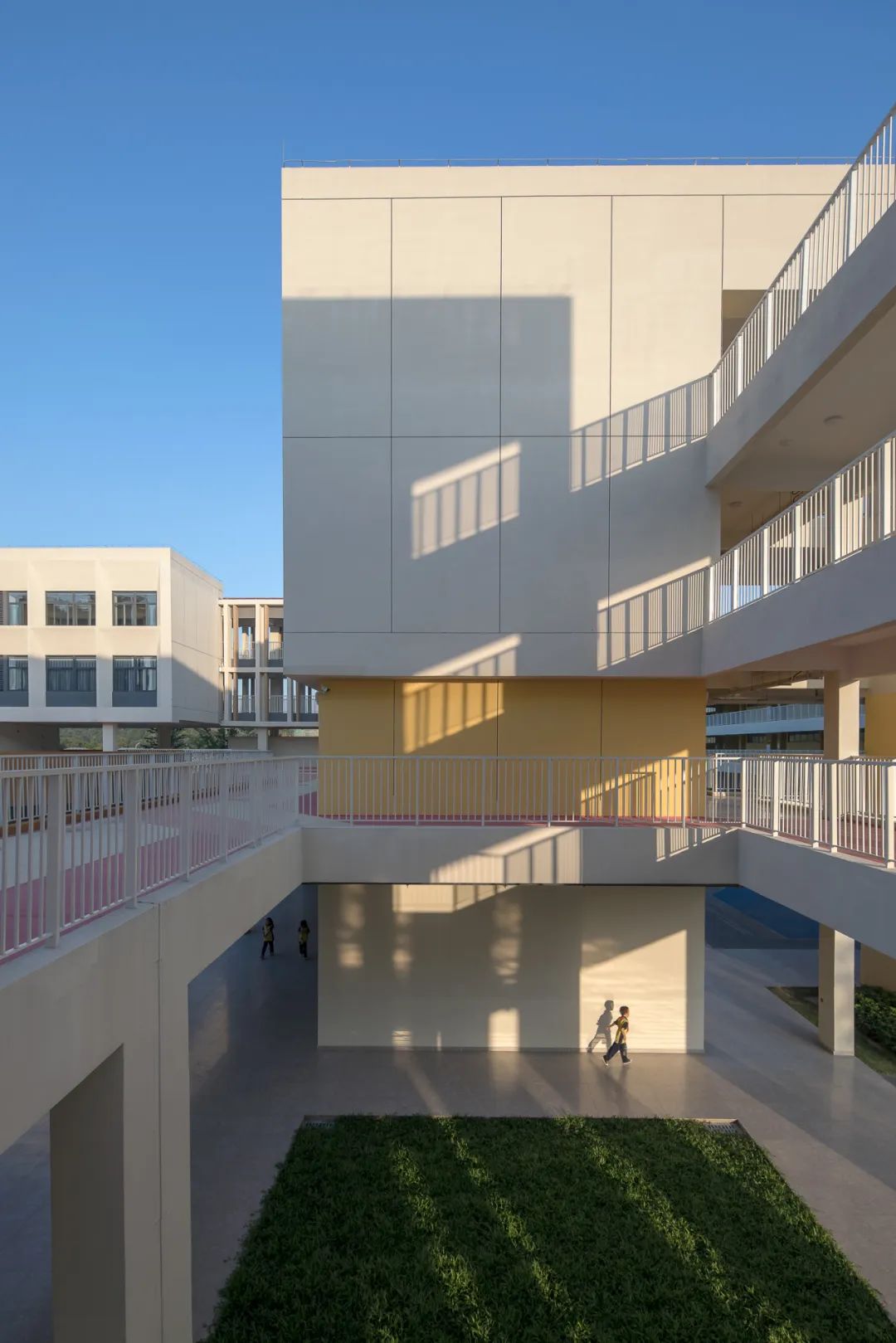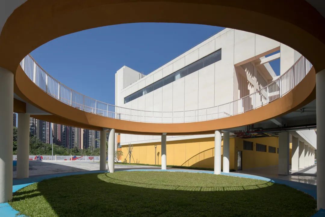 功能水平延伸的结果导致流线过长,仅以地面为连接的方式已无法满足单元之间的交流,于是在二层的位置结合常规走廊,我们将其局部进行放大成平台,不仅无缝串联起各个教学单元,还形成了一个近距离的、高效的运动交流空间,学生在课间便能自由的奔跑游戏。