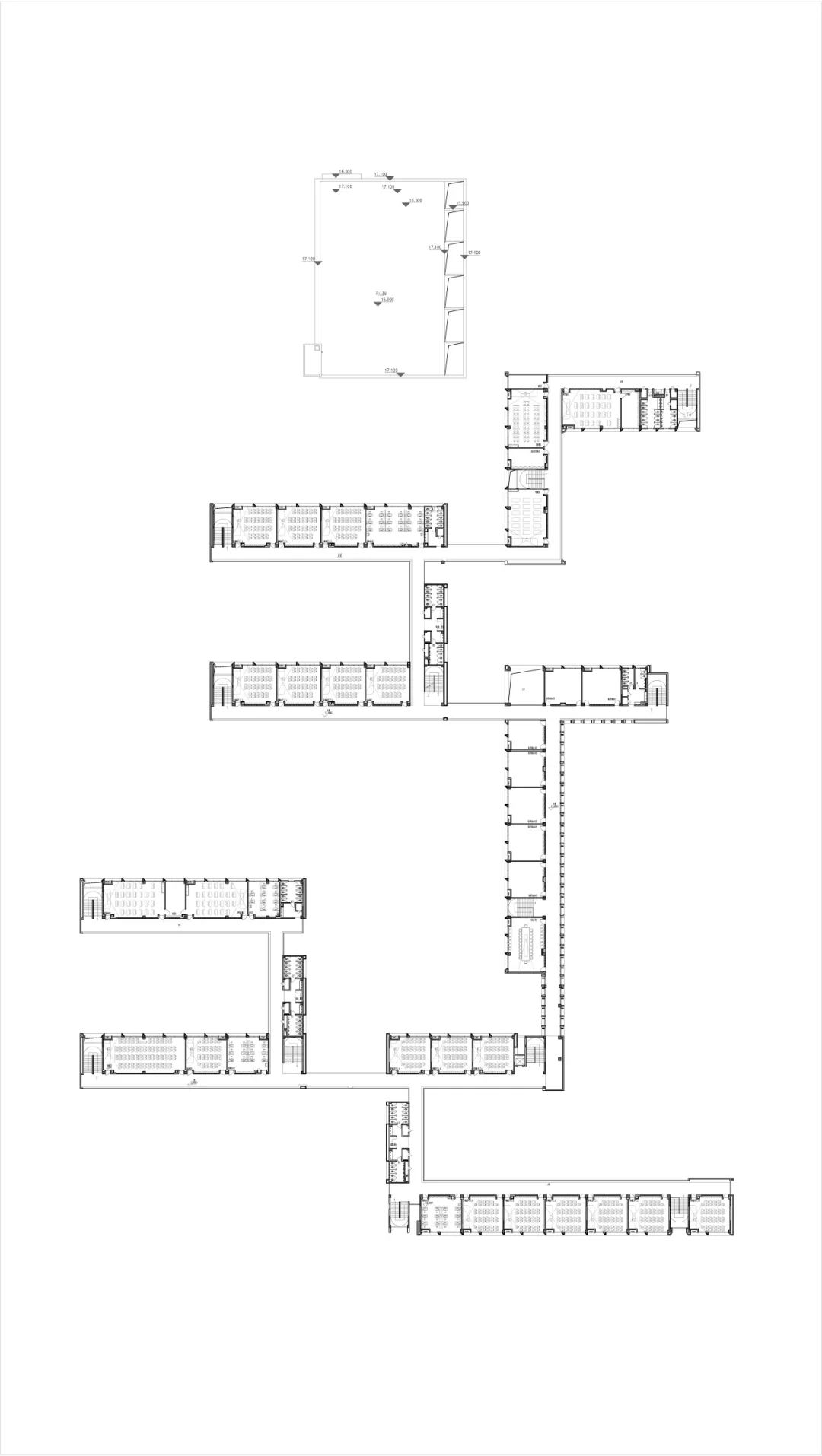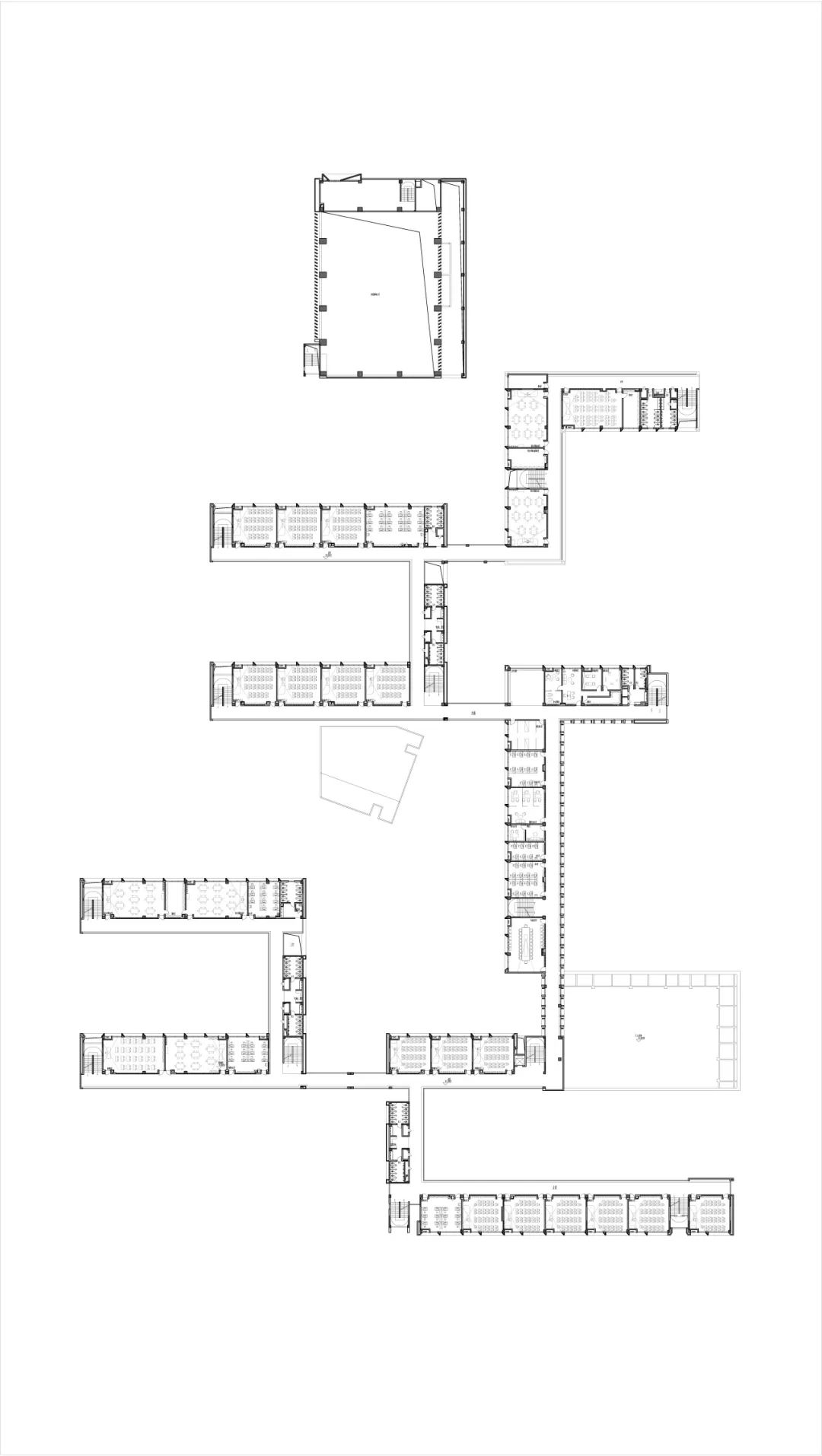 单纯的教学单元的组合呈现出了强烈的秩序感,但对于校园空间不乏有些单调。我们将图书馆、报告厅、舞蹈教室、校史展廊等独立空间提取出来,以不规则的形式置入,构建更为丰富和多元的公共空间架构。打破建筑肌理强烈的秩序感,给校园空间增加趣味性与探索性,增进学生与建筑之间的互动体验和感官交流。