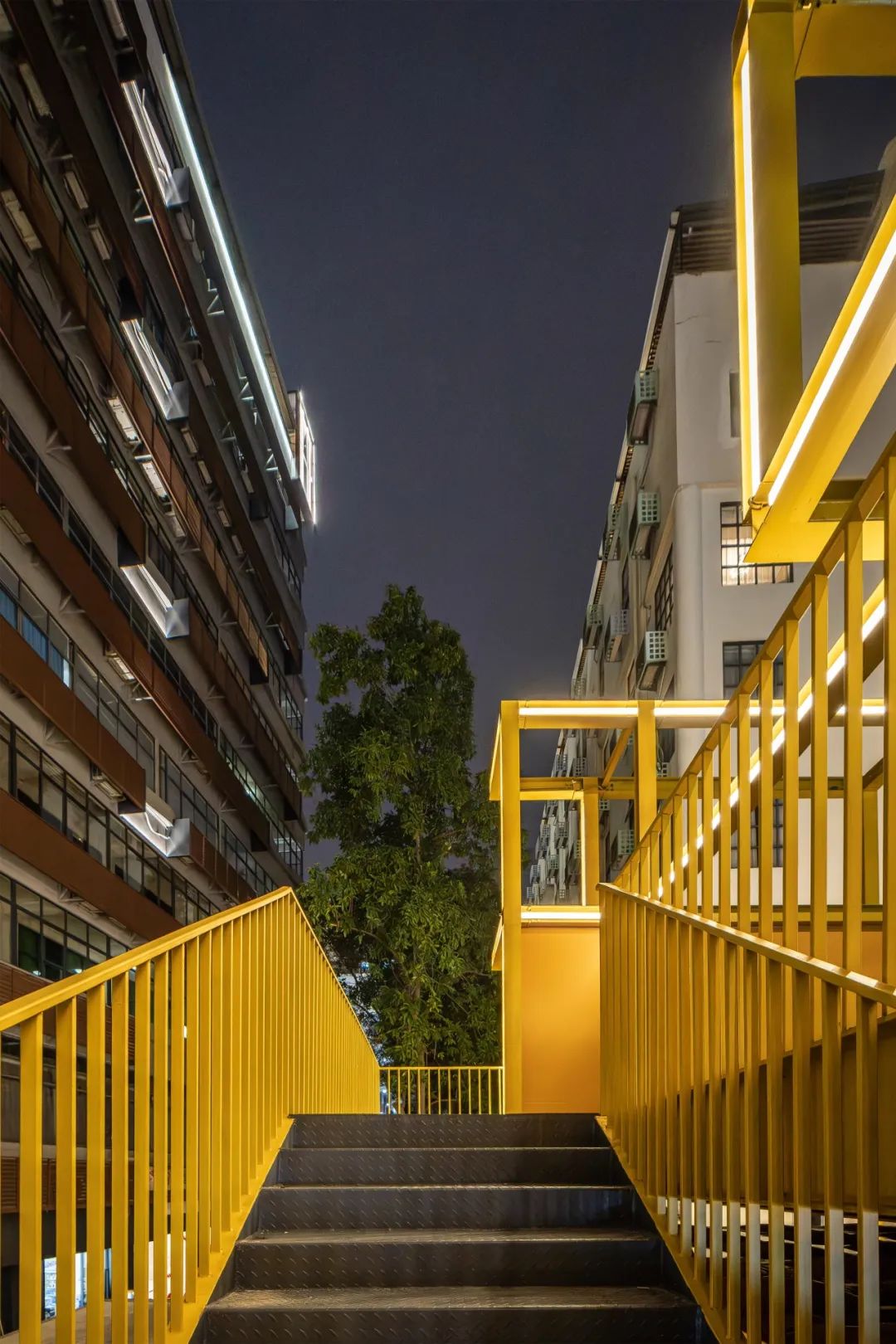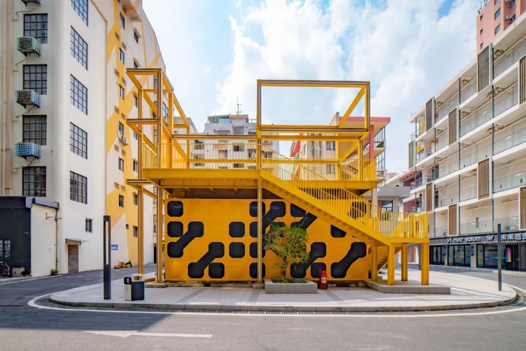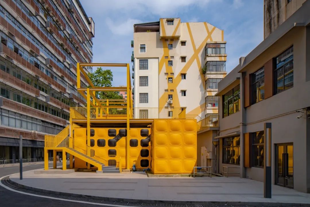 南区的消防水箱放置于园区空地,突兀且侵占活动广场。利用水箱模块化的特征,在立面上编制摩斯密码图案,以黄黑撞色激活场域;又在水箱上方搭建钢结构平台,创造出一个高低错落的二层活动广场,使之既是能打卡拍照的艺术装置,又能具有实际使用功能。