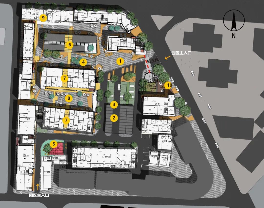 内环把原来人车混行的混杂局面梳理规划,围绕3号仓库楼形成系统的纯步行系统。