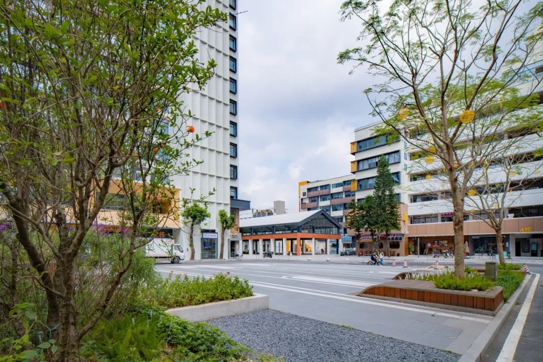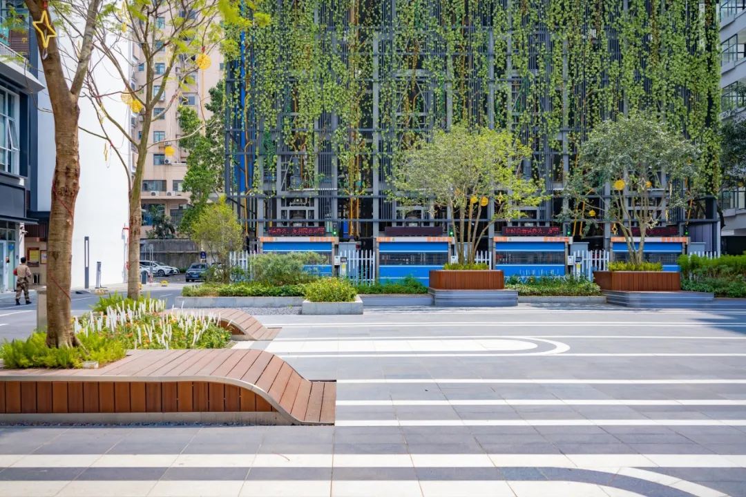 中心广场上布置简洁的线性铺装、一体化的城市家具绿化树池,为宽阔的广场空间增添点缀。