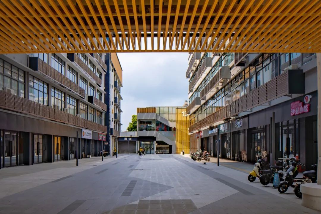 外环部分串联园区沿街商铺,将其打造成一圈有机连续的商业动线。这些商铺在园区内外两侧都有入口,改变原先一侧为后勤界面的做法,最大限度打通园区内外,增强开放性。