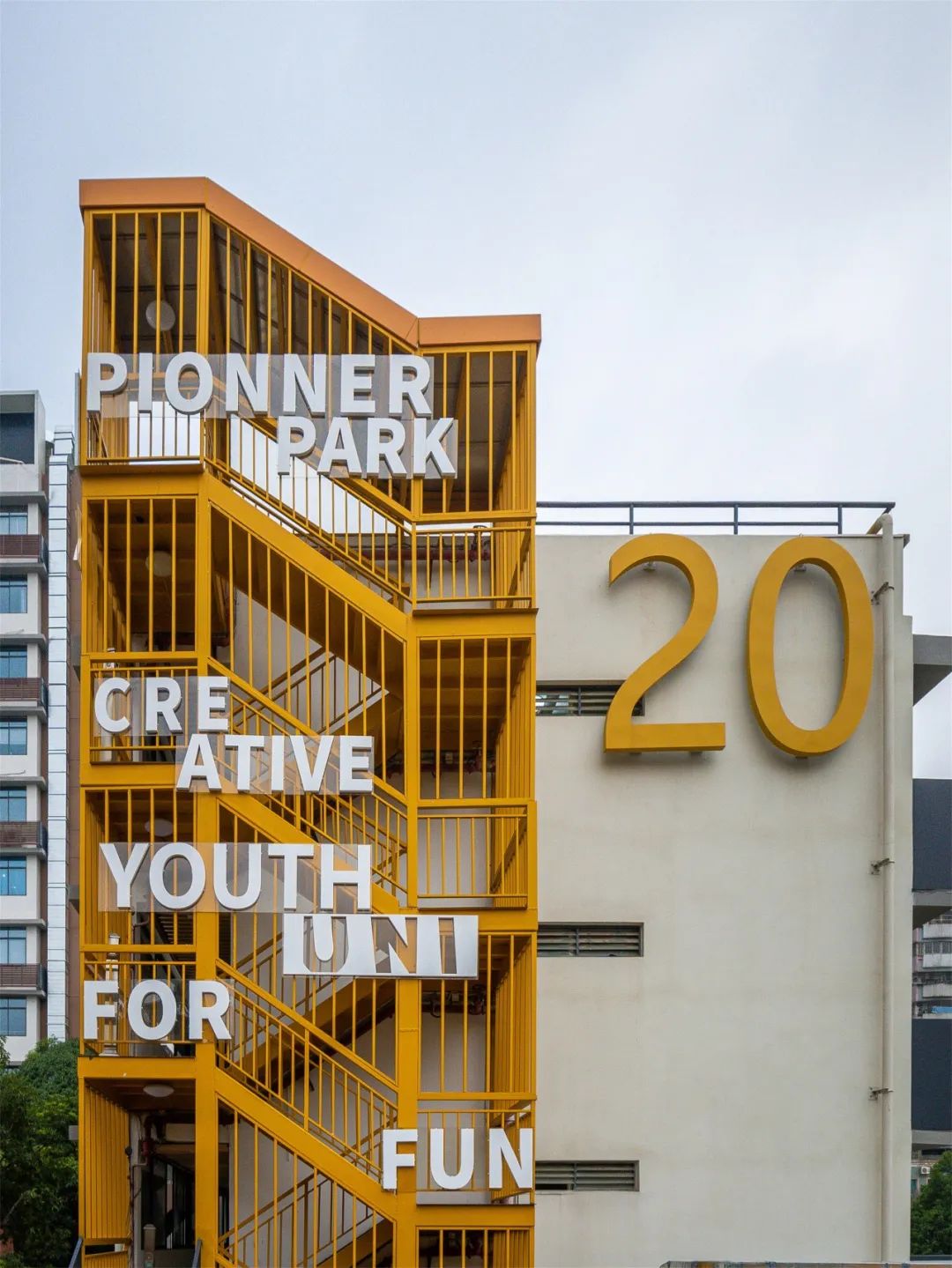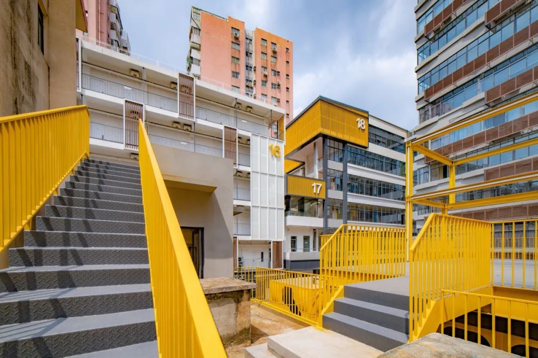 原设计中的外凸楼梯、电梯以及花坛立面存在厚实粗壮、比例失调的问题,我们采用可以自由掌控比例的表面材质使其协调配合;稍显呆板的花坛构件也被化零为整和重构秩序的手法变得生动有趣。为展示每栋楼体的标识性和趣味性,每栋楼梯结合楼栋号和天面梯房都打造了醒目有趣的标识。