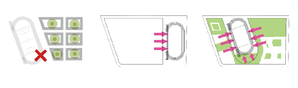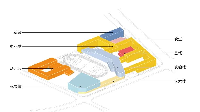 传统校园布局注重教学楼的采光和朝向,幼儿园、小学、初中、高中集中布置,室外空间单一、采光通风不好,缺少趣味性,教学区与活动场地单面交互。新校园布局增加庭院的设计,增加了学生们的活动空间,教学楼排布多样,具有较强的趣味性。本项目以运动及公共活动纽带为核心,居中布置,公共活动纽带连接运动区及教学区,校园活力值更高,幼儿园相对独立,视线通达,教学区与活动场地三面交互。