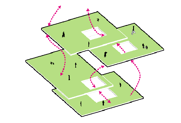 过于均质的空间分配与单一的流线组织对于小学生而言是缺乏启发与想象力的。项目设计让地景一体,在校园中置入贯穿整个校园的公共活力纽带。活力纽带是一个由楼梯、坡道、大阶梯、架空层、屋面花园等串联起来的连贯的社交空间体系,以体育场为核心的活力纽带贯穿整个校园,串联了校园七大功能板块,分别是幼儿园、体育馆、兰生大草坡、艺术楼、图书馆、剧场、餐厅。