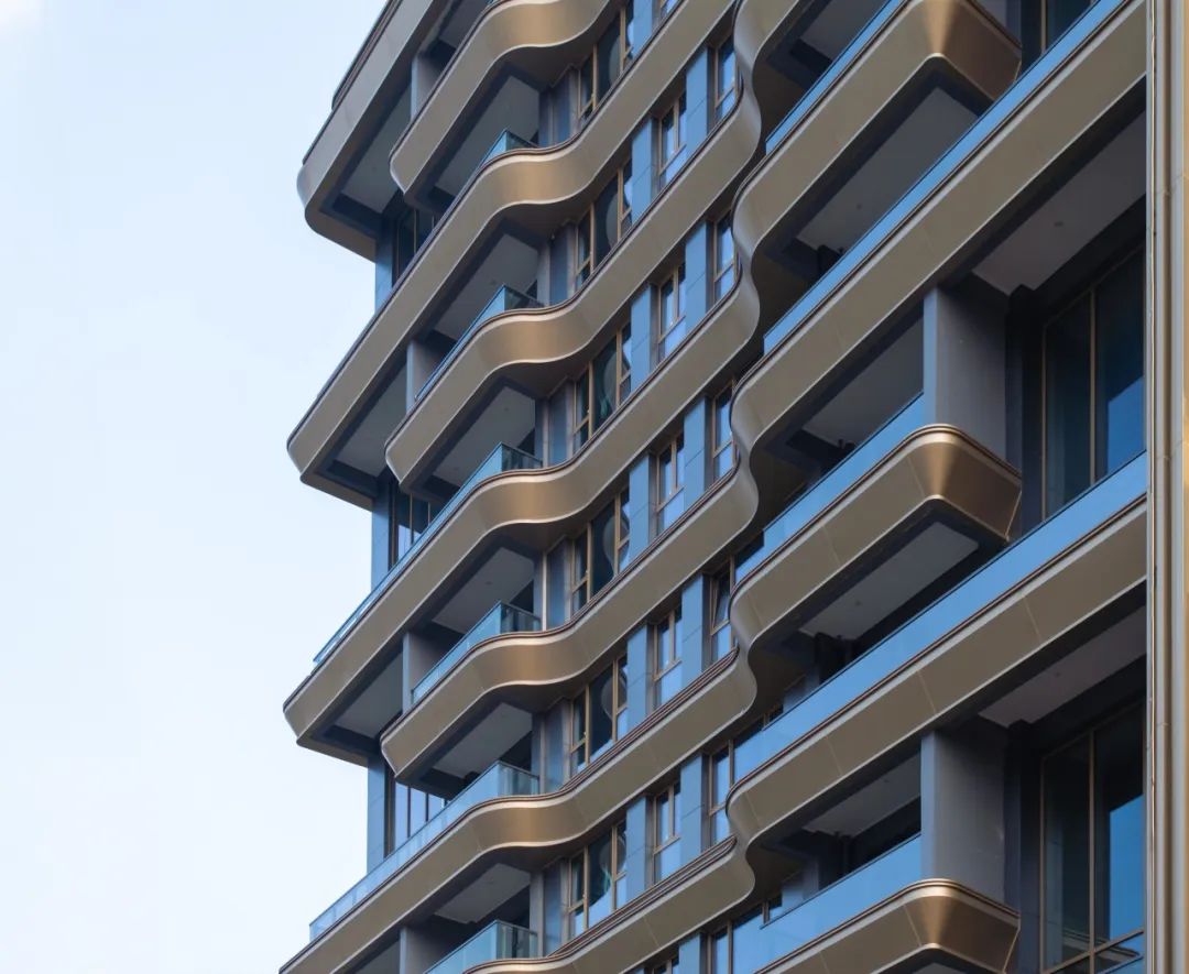 在材料选择上,我们大量使用玻璃和金属铝板,以浮动弯曲的香槟金铝型材和灰色玻璃间的动态距离创造出鲜明而极富流动感的动态曲线,呈现出既稳重又灵动的建筑形态,独创白云山新贵风姿。