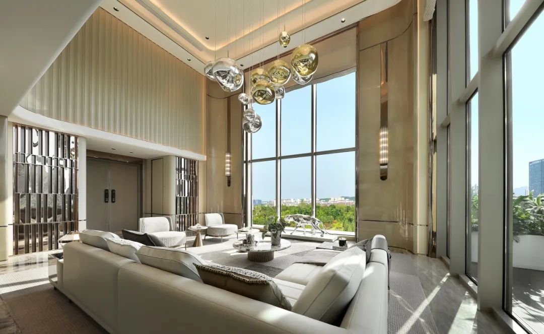 项目创新研发“空中平墅”产品,在横向面宽延展超20米的设计下,突破平面束缚向上延伸,打造了约6.6米挑空、200m³立体客厅,将别墅的垂直尺度与大平层的横向尺度融合,创造平层“墅居”的生活体验。
