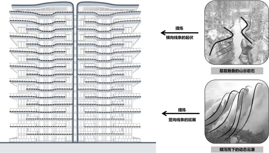 我们希望打造一座仿佛“自然生长”的建筑,赋予项目独特的风貌的同时,在山水写意中融入中式美学和未来主义特色,塑造一种全新的建筑形象,使建筑群体如同城市中的艺术品,以一种几乎悬浮的姿态,轻盈地融入周围的自然景观,减轻对公共空间的视觉压迫。