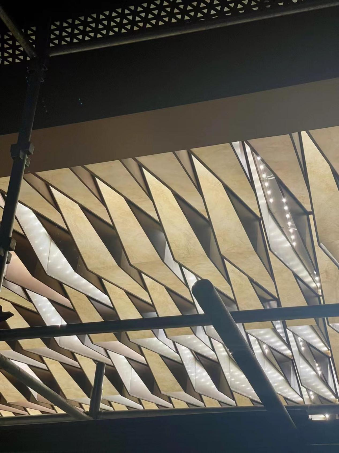 门廊顶棚满铺星空天幕,穿孔铝板通过参数化表皮设计,呈现中间密两边疏的灯光渐变效果。中央悬挂9*12米巨型龙鳞灯毯,由365块定制模块组成,作为廊下的主照明。