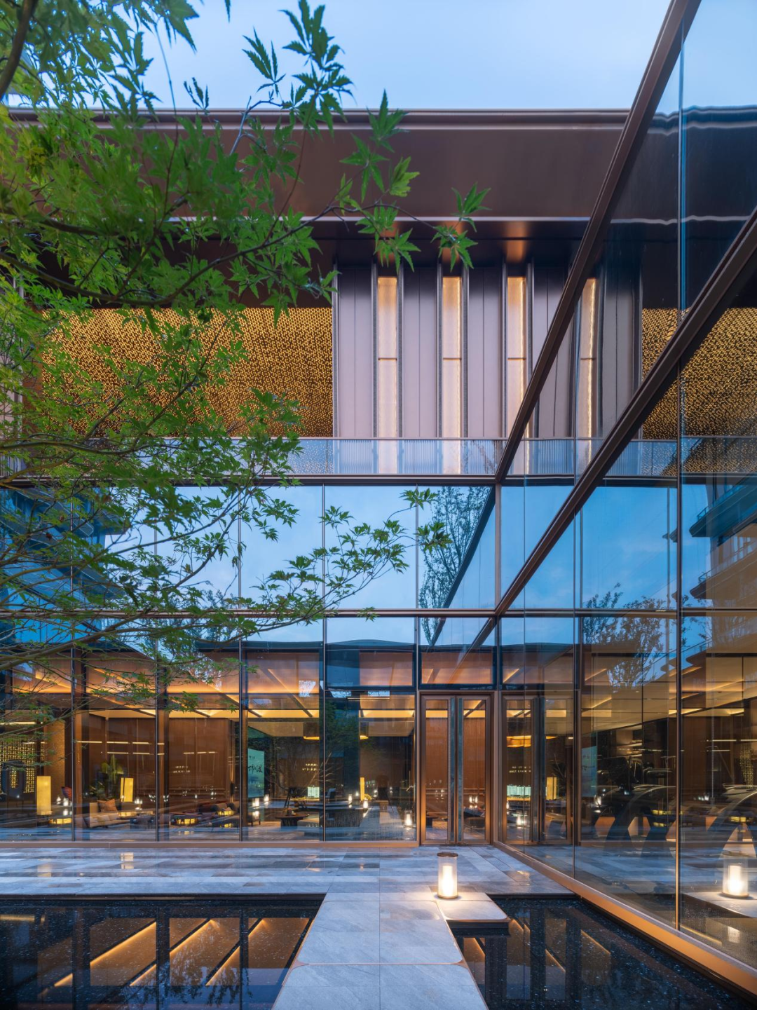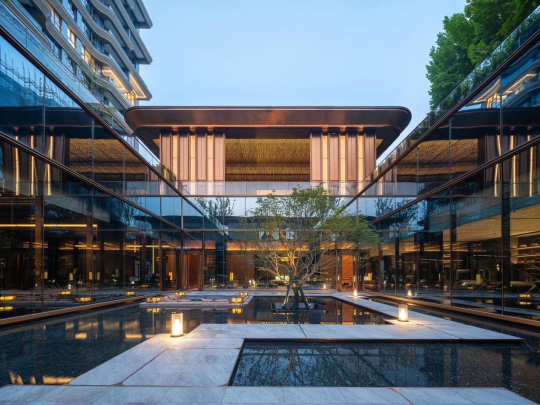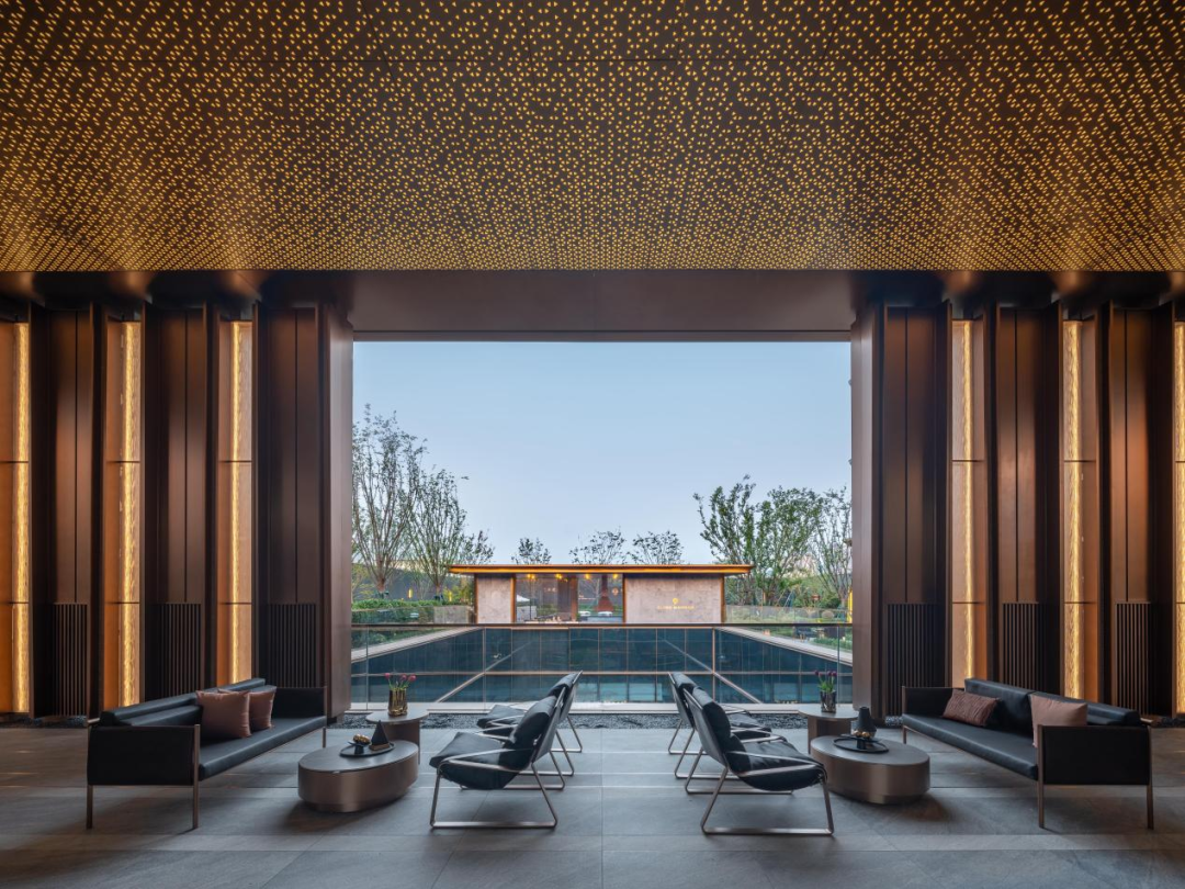 步入门厅后场,廊下灰空间是室内与室外的缓冲,重奢的室内空间与极简静谧的园林空间形成反差。360°环幕光瀑下沉庭院内,一袭流瀑,一株枫树,四面落地玻璃,以景入室,融于自然。