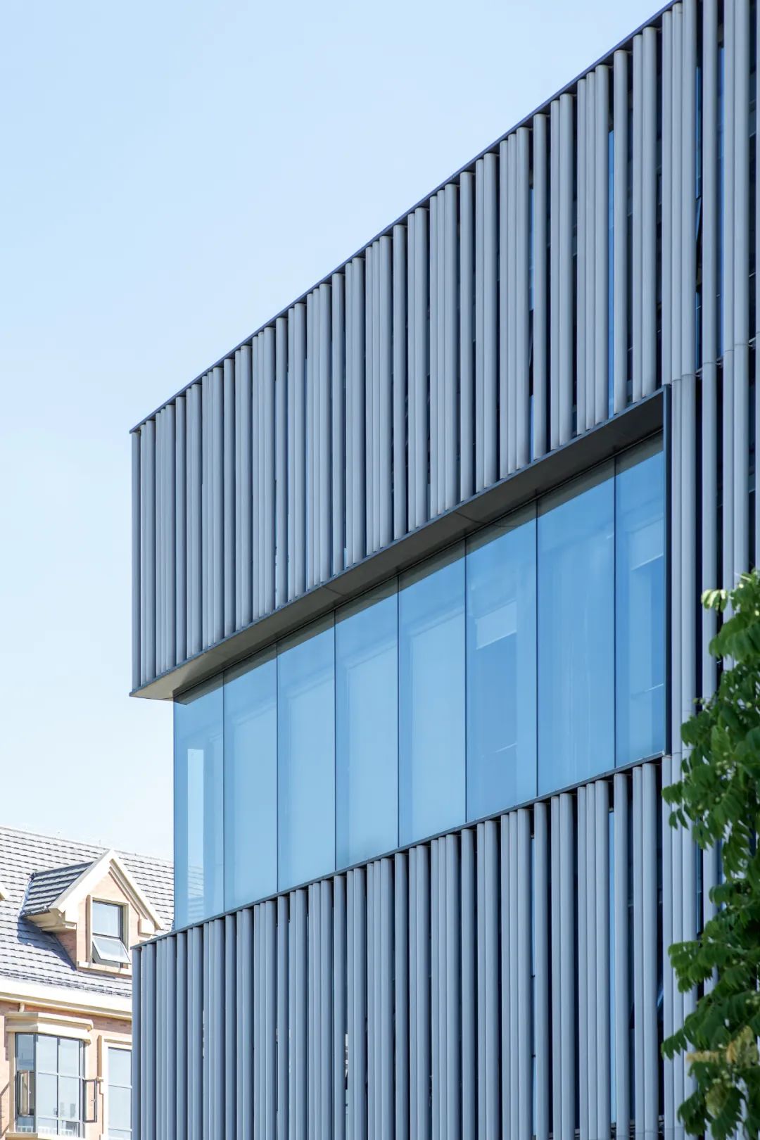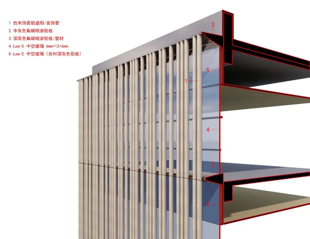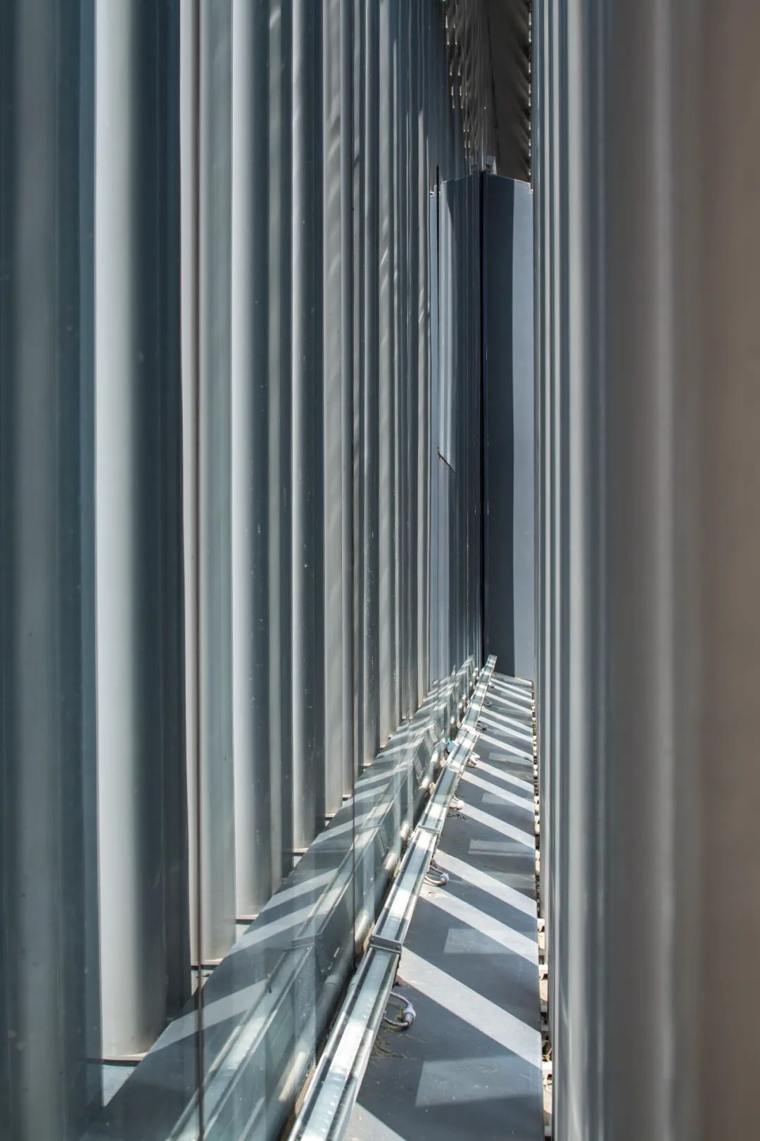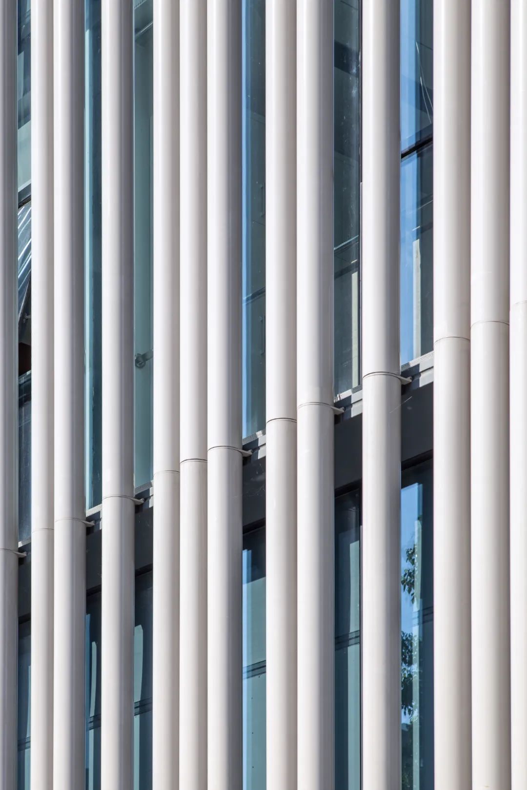 外部采用铝合金圆管,遮挡后面并不平整的窗墙体系的玻璃幕墙,同时形成一定的韵律。