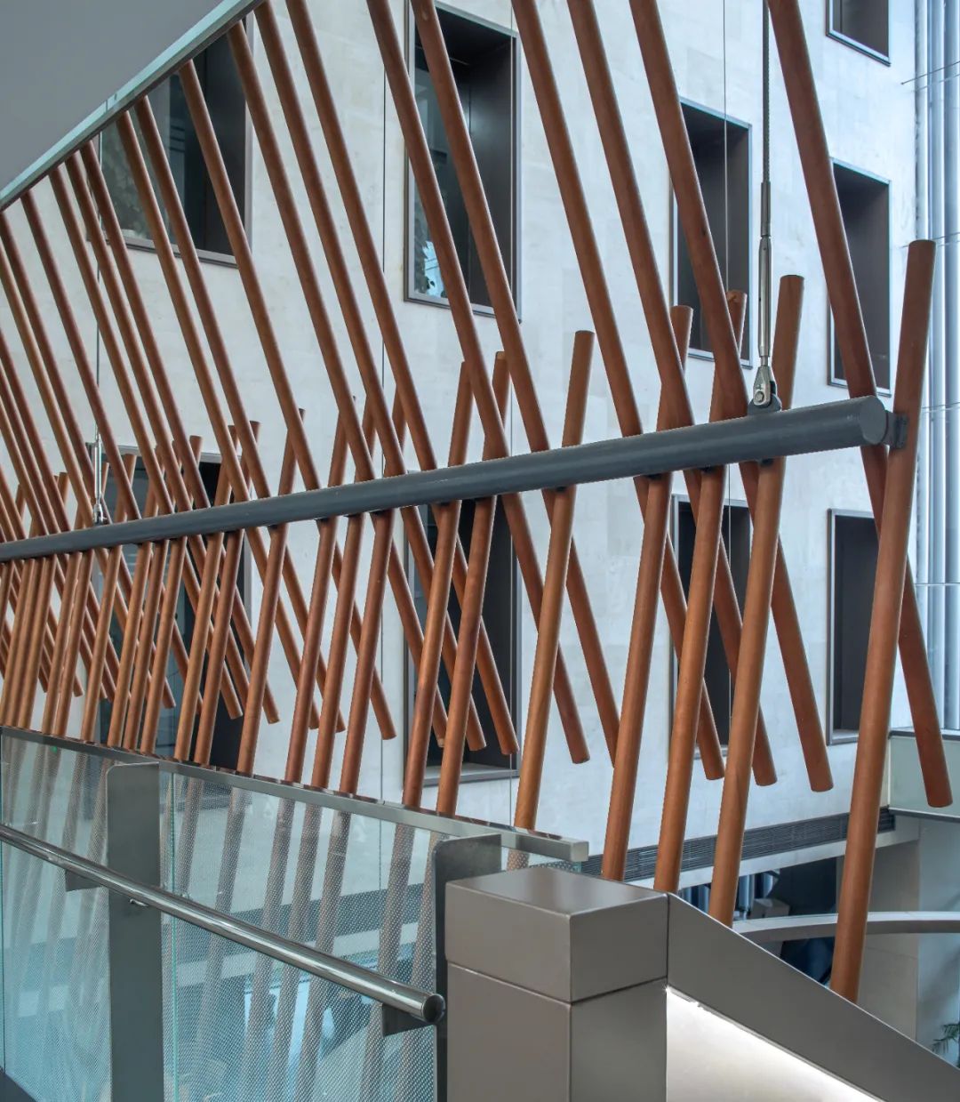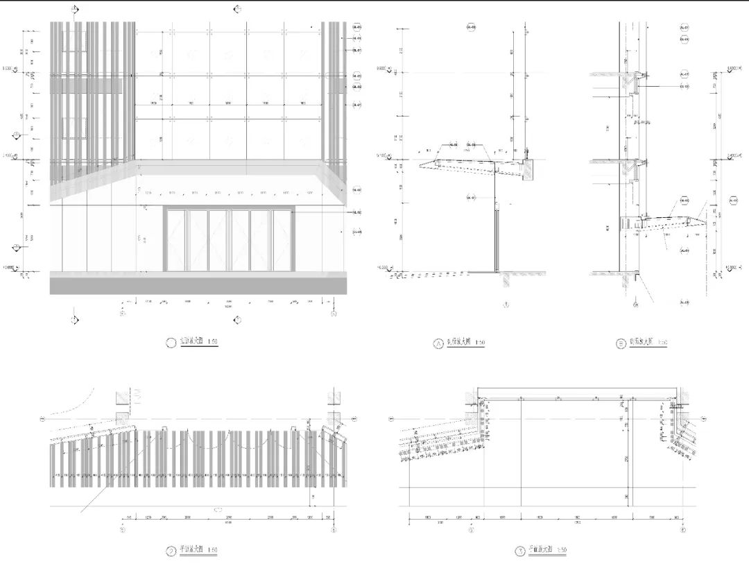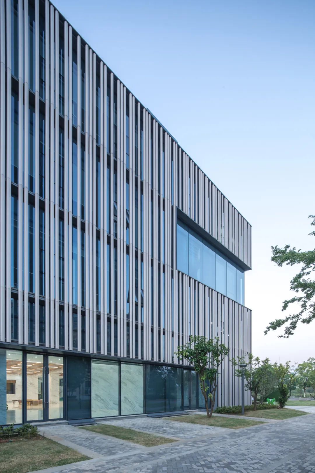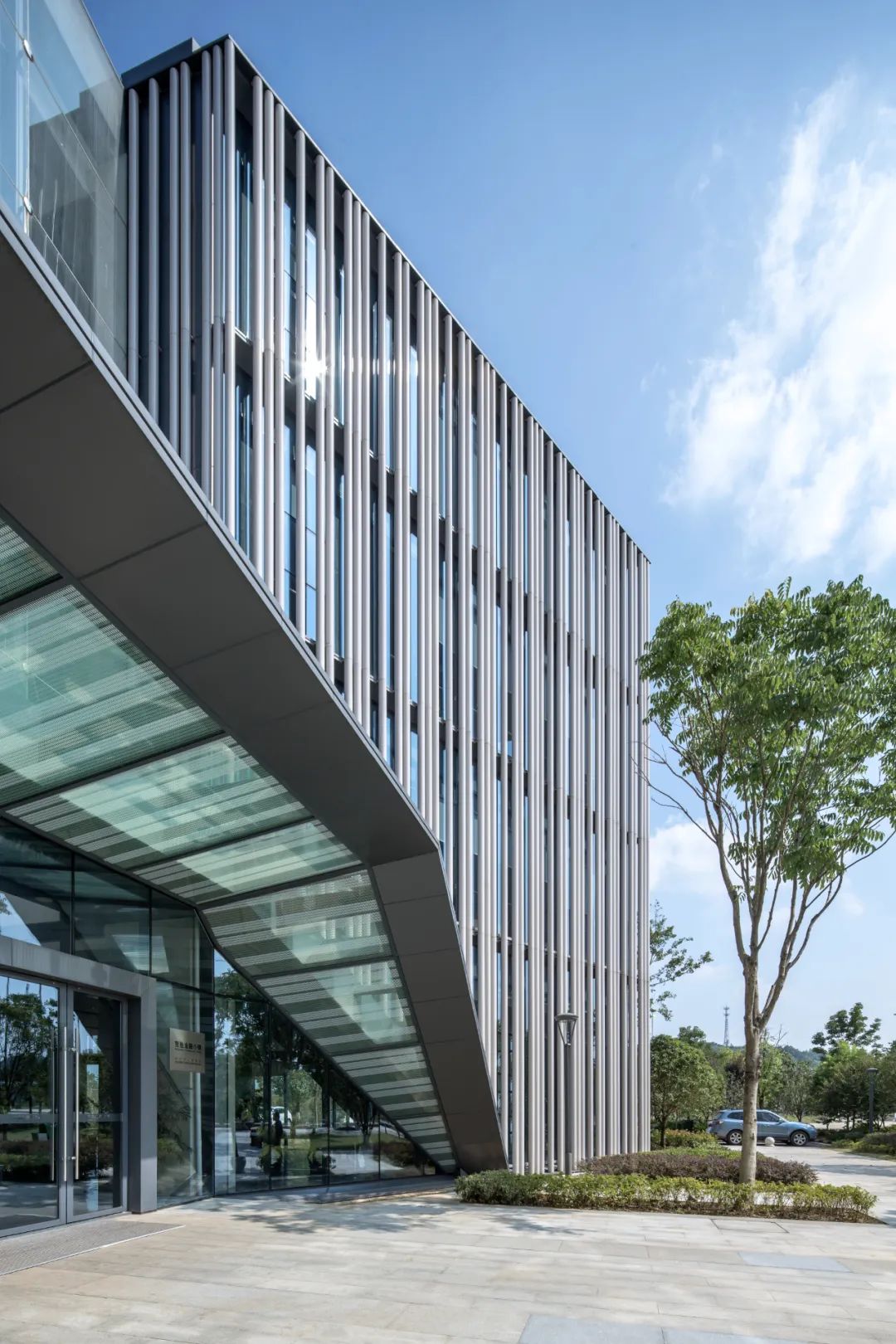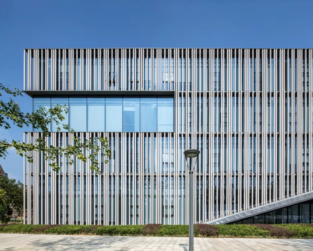 外部采用铝合金圆管,遮挡后面并不平整的窗墙体系的玻璃幕墙,同时形成一定的韵律。