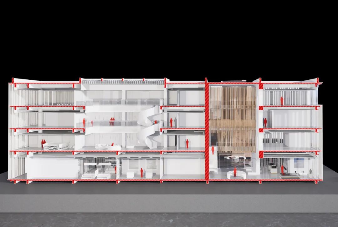 这个办公楼虽然只有5000平米,但是功能并不简单,拥有对外的招商中心、展厅、集团办公和食堂,主要分为公共部分和私密部分。