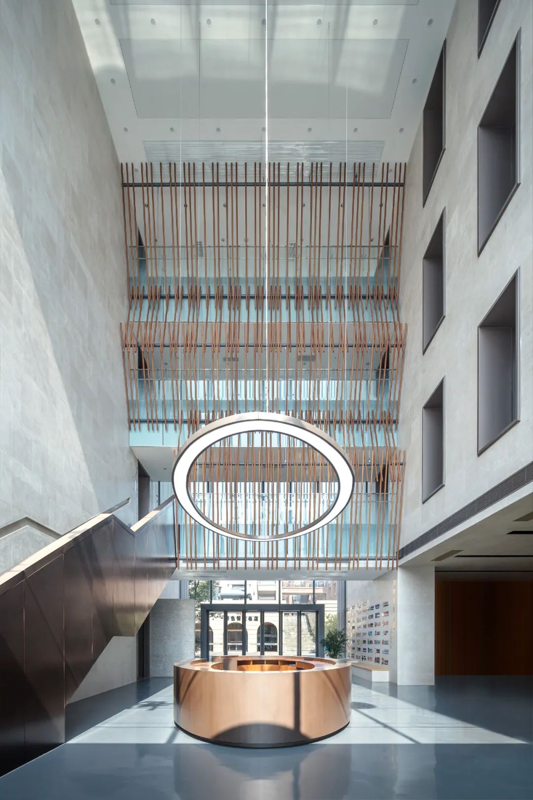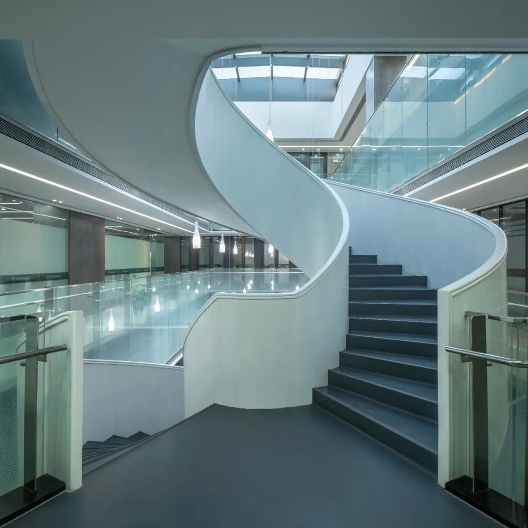 旋转楼梯是整个中庭的视觉焦点,为了更有现代感采用了白色搪瓷板使板壁显得轻薄。