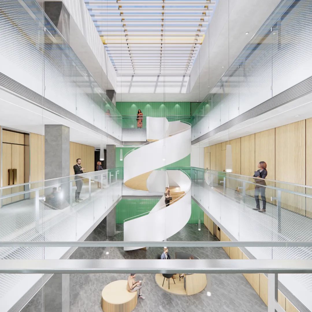 二楼空中中庭围绕一个旋转楼梯展开,同时也是两边办公休息的场所。
