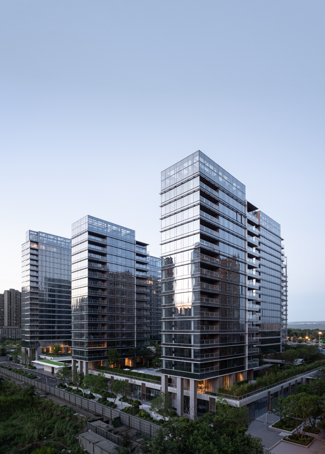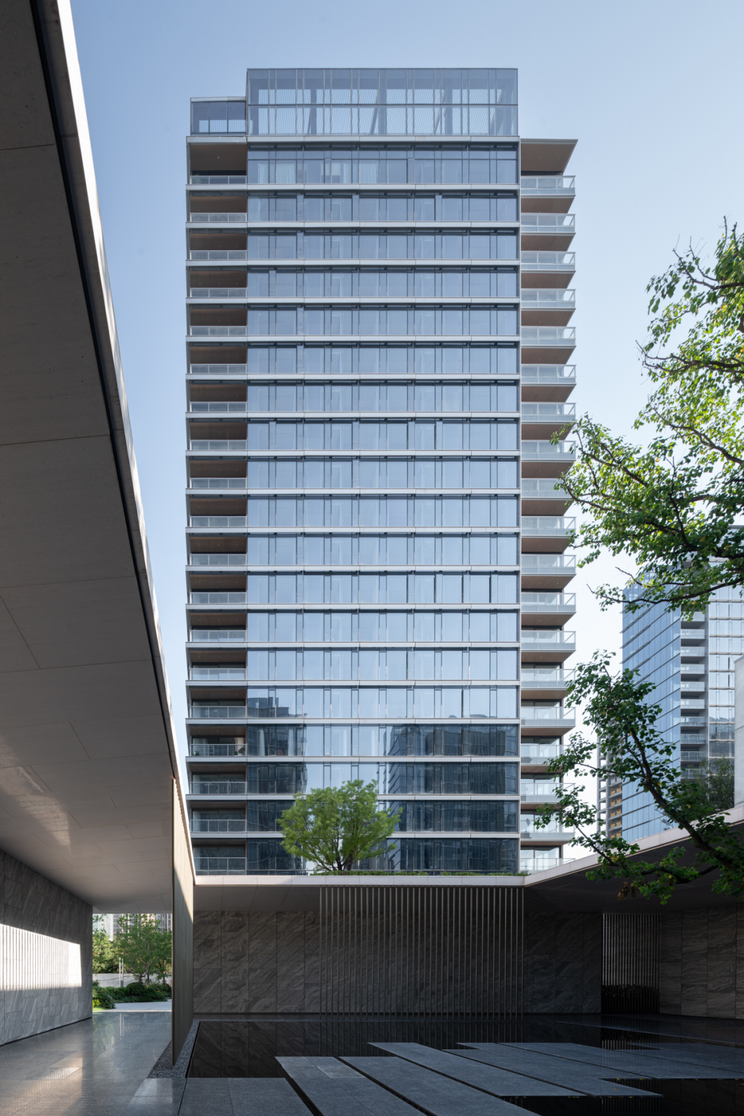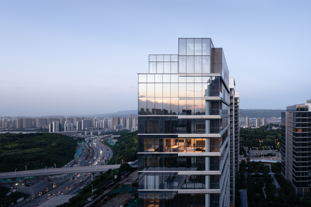 立面设计以石材形成稳定基座,全玻璃幕墙带来挺括的生长感,顶部收缩在强化向上之势的同时减轻了楼栋的视觉重量感。金属遮阳板和幕墙间的金属线条进一步精致并丰富了观者、居者的品质体验,并让住宅有了更多因自然而生的变动。