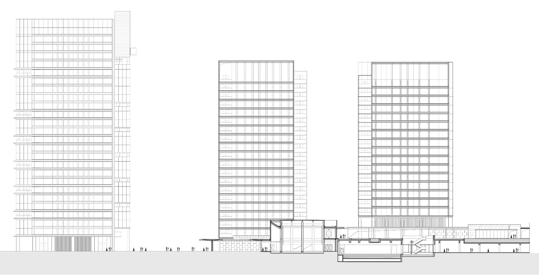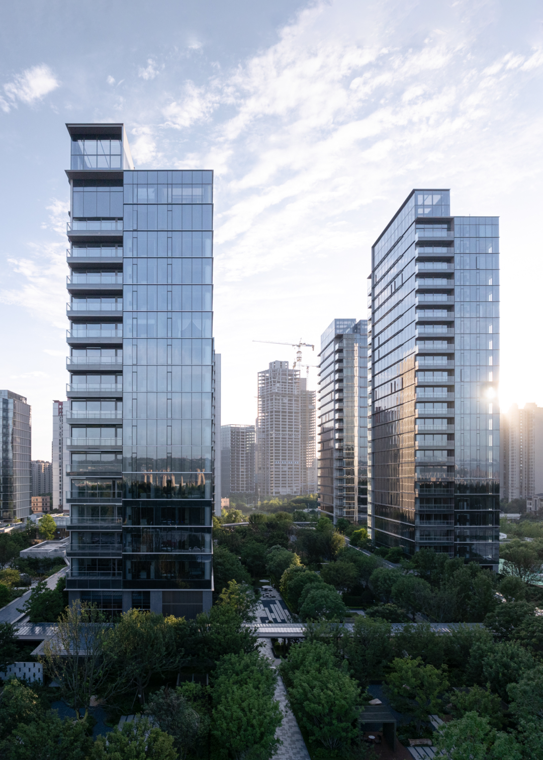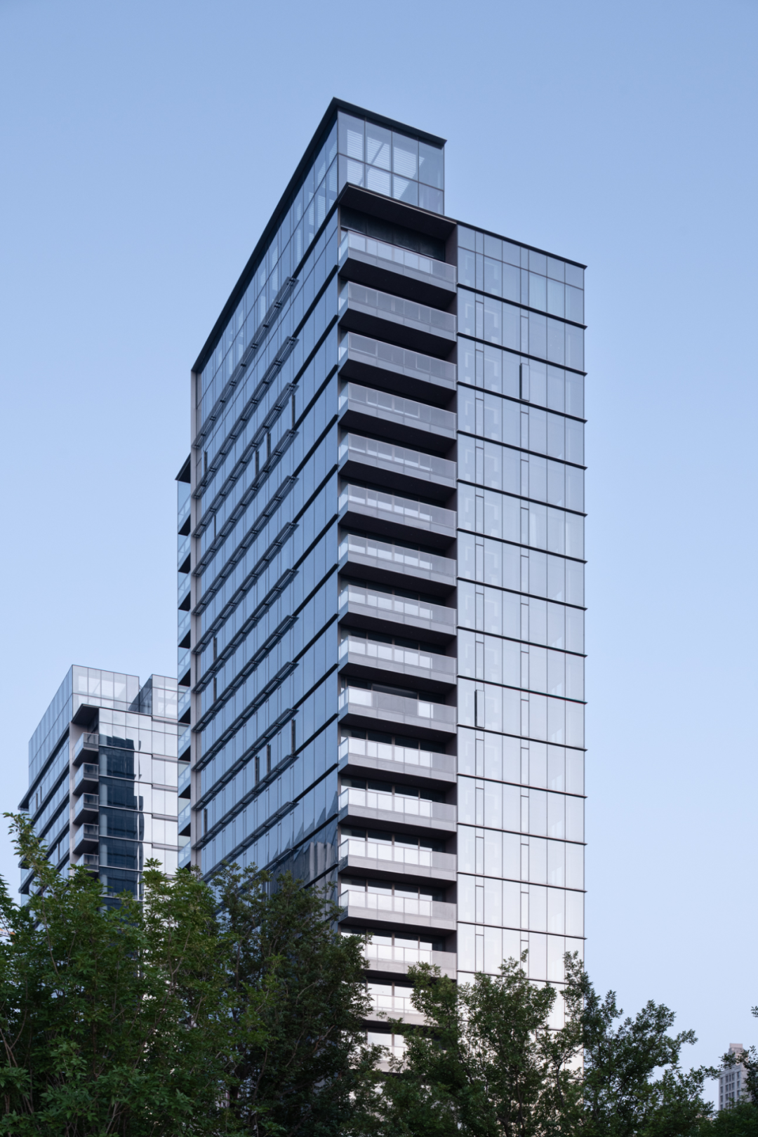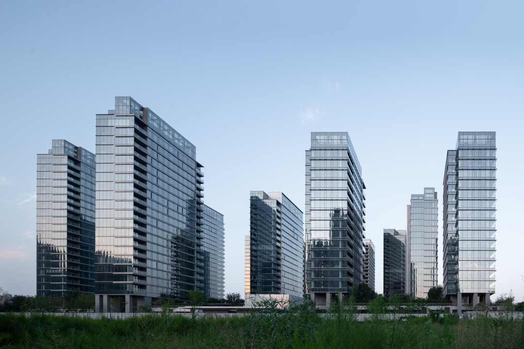立面设计以石材形成稳定基座,全玻璃幕墙带来挺括的生长感,顶部收缩在强化向上之势的同时减轻了楼栋的视觉重量感。金属遮阳板和幕墙间的金属线条进一步精致并丰富了观者、居者的品质体验,并让住宅有了更多因自然而生的变动。