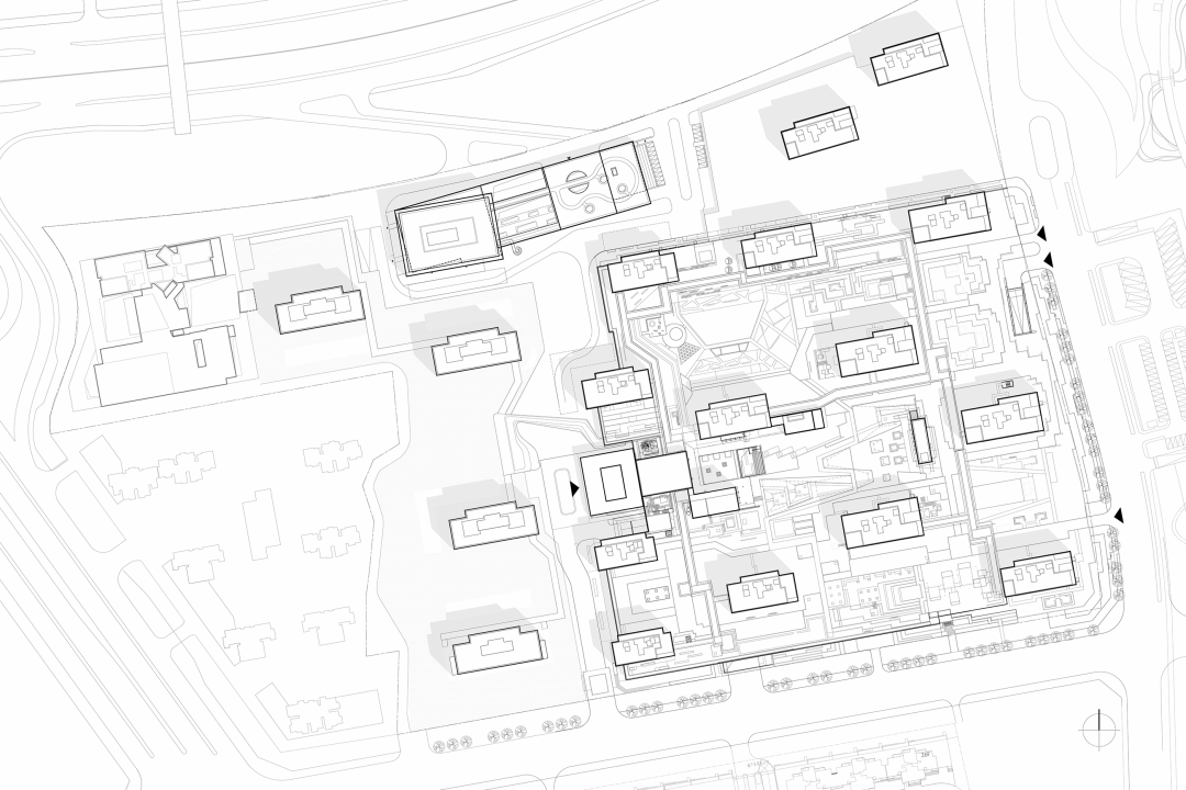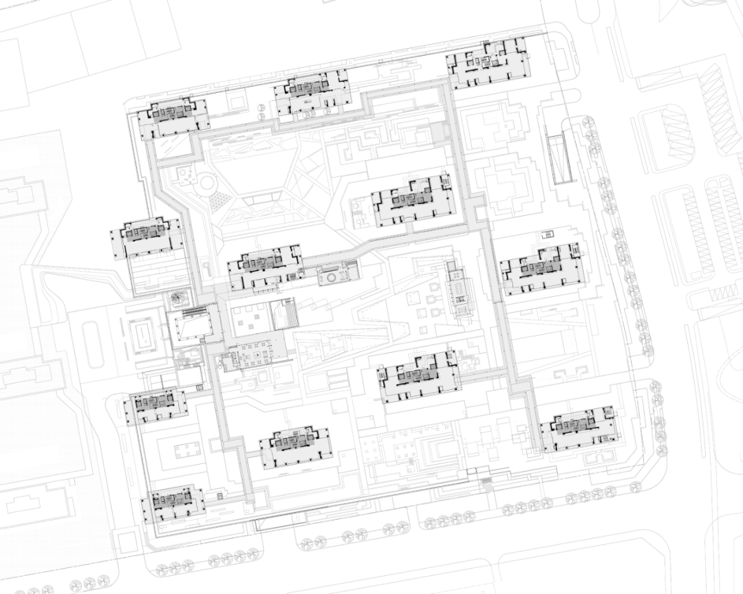 我们将项目定位为 “都市街区式综合社区” ,在注重社区营造的同时也关注社区与城市的过渡、互动关系。设计建立了一条以 “曲江印艺术中心”(点击项目名查看项目推文)为起点的,南北向的与城市相连的开放街巷,与融合公寓、商业、酒店、服务业等不同功能产品,构建介于城市公共与私密住区间的公共空间系统。街巷同时将场地分成两个相对独立的小街区,消解大尺度用地,打造更亲人的社区组团。曲江印艺术中心 ( 点击项目名查看项目推文 )