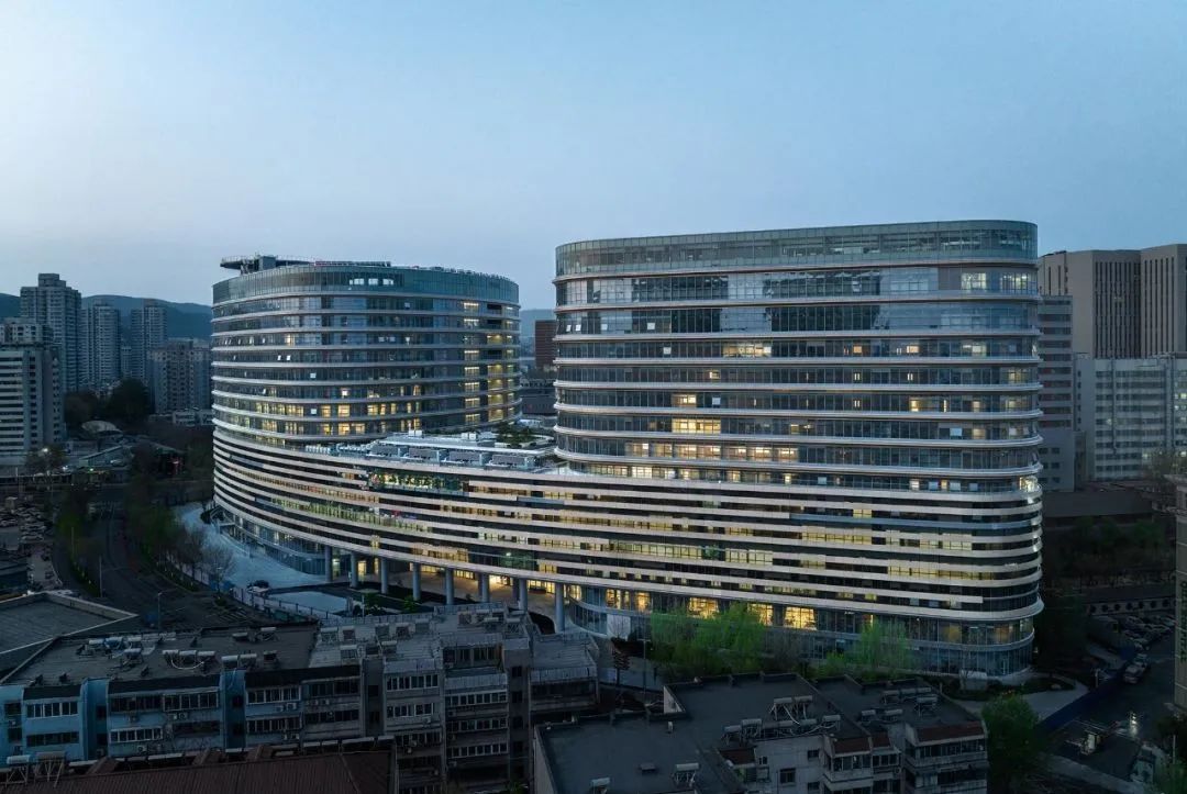 该项目用地形状近似一个有缺口的三角形,南侧紧邻山东大学趵突泉校区,北侧靠近趵突泉公园和泉城广场,是济南市重要的历史文化空间节点。建设用地面积约为23,800 ㎡,南、北两侧用地的高差约为6 m,建筑限高60 m。另外,项目处于趵突泉泉域汇集区,地下开挖深度受限。在高容积率、低限高、低限深的情况下,本项目通过层层逻辑推导,因地制宜,采用流线型三角形双塔楼布局策略,在双塔之间形成视线通廊,巧妙地避免其对老住院楼造成视线干扰。