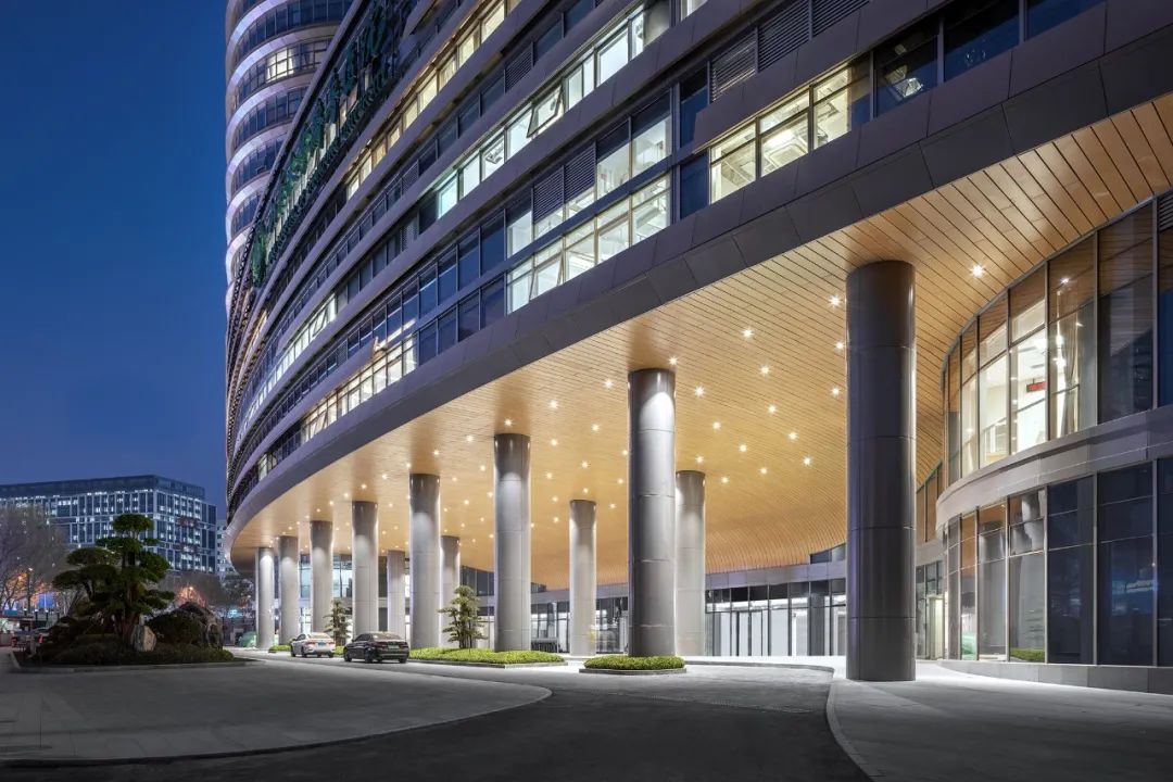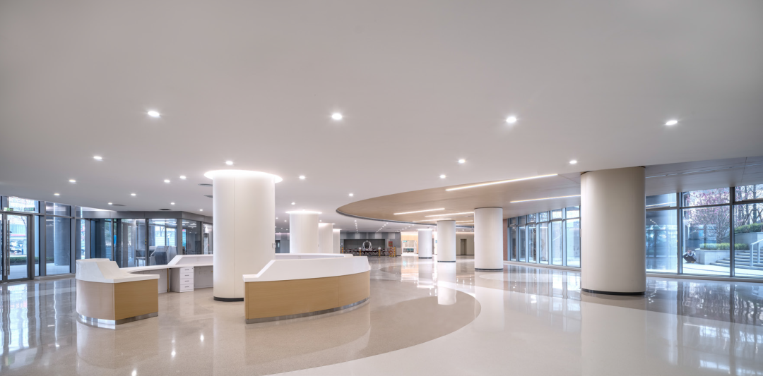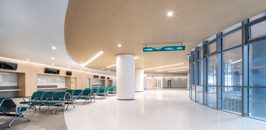 流线型裙房造型灵动流畅、简洁而富有变化,具有强烈的水平延展性,形成独特的城市街角形象。首层局部架空,营造出亲和、自然的空间序列,使区域内的街区关系更加自然和谐,有效缓解近人尺度的压迫感。项目实现了医疗功能与城市关系的平衡。