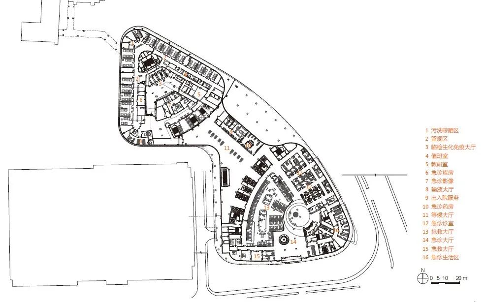 山东大学齐鲁医院急诊综合楼以低矮谦逊的姿态(犹如两个山谷),创造出一个治愈花园。未来,随着城市更新和人口结构的变化,山东大学齐鲁医院作为区域医疗中心,其医疗综合体的内部必将经历灵活、动态的改建过程。新建的急诊综合楼将在满足医疗需求的基础上,以开放、和谐的姿态融入城市公共生活。