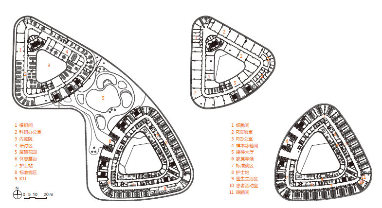 流线型三角形标准平面最大限度利用朝向,其中:南塔标准病区沿三角形外侧朝南向和东北向布置病房,沿着三角形内侧(庭院)布置医护人员的办公室,保证患者、陪护人员、医护人员等人群在就医、陪护、工作时均能享受到自然采光,拥有开阔的视野,并获得积极的空间使用体验;北塔科教区每层均设置共享交流厅,为科研人员提供休憩活动场所,有效促进医院科研技术的发展。