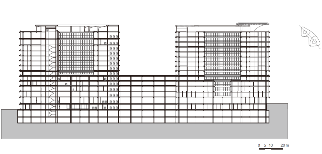 住院部位于医技裙房上部,内设上下直达的医梯,使护理单元与医技板块、急诊板块紧密联系。住院部可高效直达影像中心、手术区等医技区,相关功能间距离更短、效率更高、整体性更强。双护理单元的设置使病区可相对独立,也可共享人力、设备资源,满足按病种设置病房的要求。医梯集中布置,可提高空间使用率。