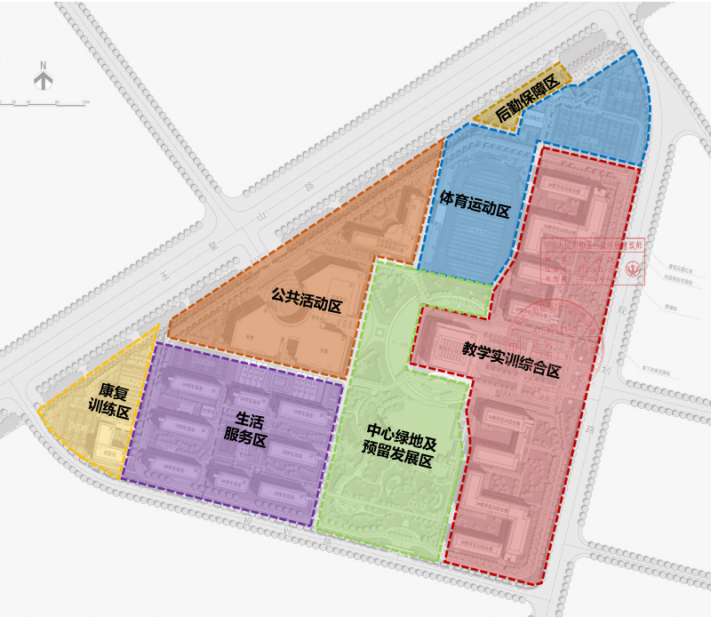 校园共分为7大片区:教学实训综合区、公共活动区、生活服务区、体育运动区、康复训练区、中心绿地及预留发展区、后勤保障区。
