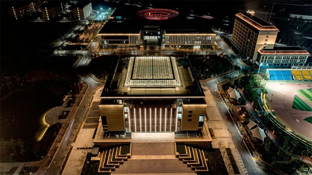 ▶ 图书馆:位于校园主轴线上,是校前区的核心建筑,东面正对校园主入口,西接学生中心组团,北邻体育运动场,南与校园公共绿化区相望,人文景观线索与自然景观线索在此渗透融合,使之成为校园重要的景观节点。将建筑置于首层基座上,通过体量的穿插交接,彰显其校园核心位置,塑造校园景观天际线。
