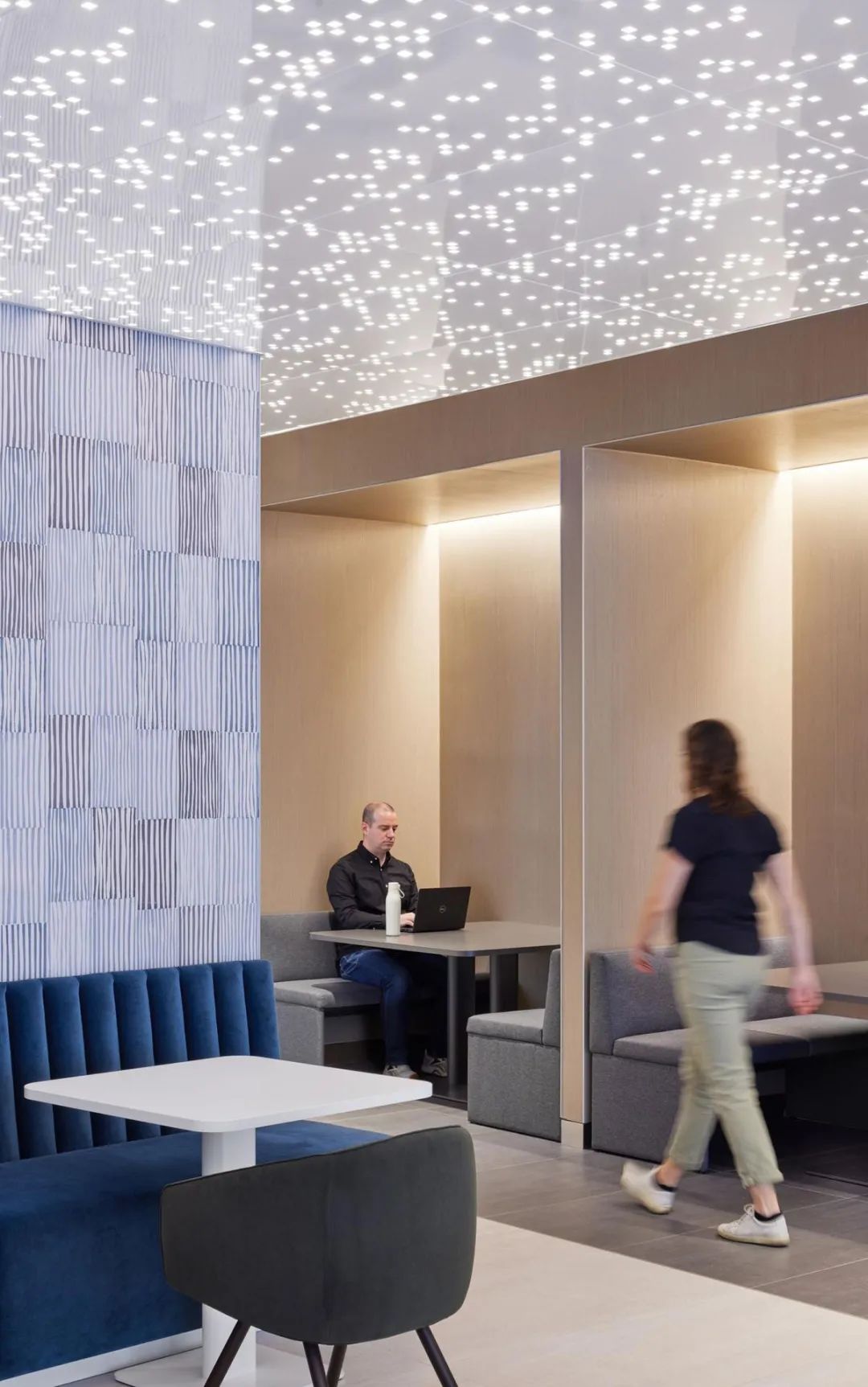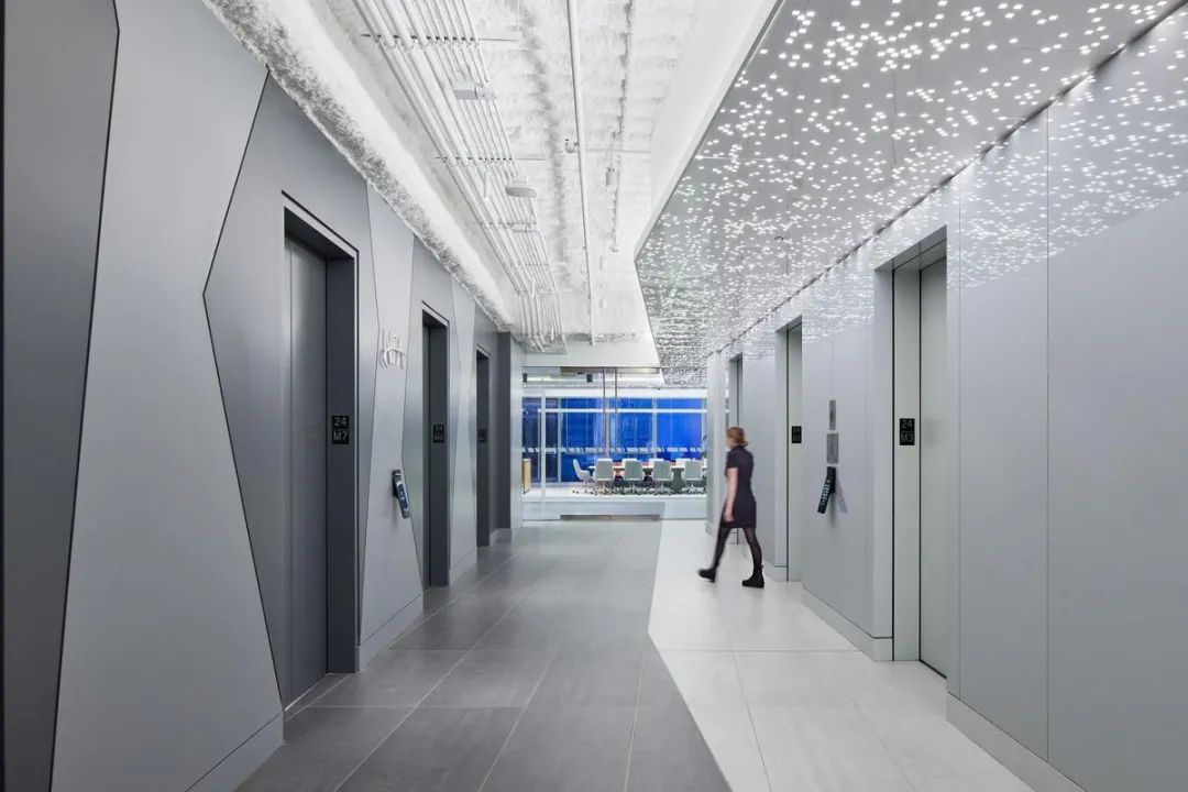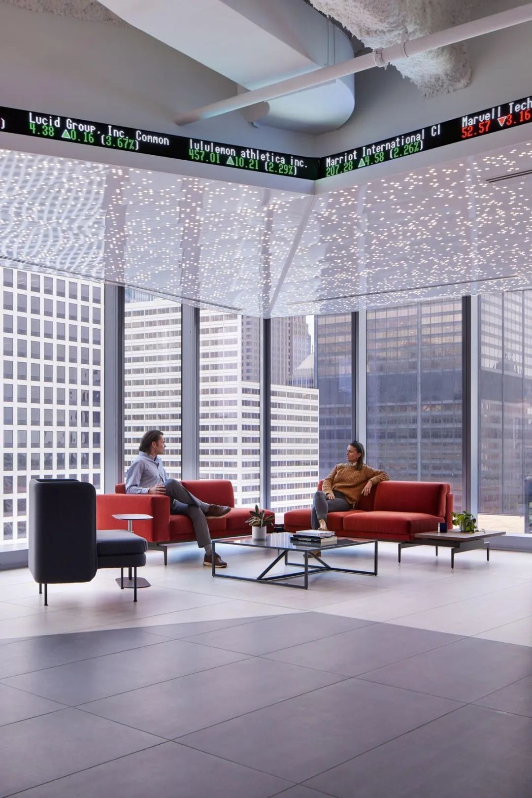 NFA在整个疫情期间考察了多个办公空间,并以NELSON的空间规划专业知识指导其选址和抉择。该组织需要一个交通便利、设施齐全、拥有强大技术基础设施的办公场所。最终,NFA的目标是以经济高效的方式打造一个以人为本的环境,让员工每天都能在这里愉快地工作。NFA 在芝加哥南运河 320号选择了一座充满活力的新建筑,NELSON负责将该组织的使命、文化和四十年的历史融入到建筑空间的设计中。大楼的外观由尖锐的几何形状和垂直线条构成,引导着人们的视线向上看,这给予了本案的设计理念“折叠”。折叠借用了折纸中“无限可能”的哲学思想,强调以全新的视角将任何空间转化为全新事物的潜力。通过对墙壁、天花板和地板等元素的角度处理,设计团队创造出了一个引导客人和员工走向用于互动的战略交叉点的空间。玻璃立面、自然光和城市景观视野主导了整个室内空间。新办公的设计提供了种类繁多的工作空间,以满足各种工作模式需求。从客厅式休息区、厨房岛到私人办公室和灵活的办公空间等营造“居家般”的舒适体验。整个布局被战略性的小建筑单元划分开来,确保员工无论在办公室内的任何位置,都能便利地使用协作室、电话间和会议室。为了提高步行效率,NFA的大型训练室和咖啡吧特意放在楼层的一个专属区域。这样的战略规划不仅确保了所有员工都能欣赏到办公室的最佳景色,还创造了更多的偶然相遇的机会、促进了更多的交流。咖啡区还充当了鼓励人际互动和协作的催化剂。设计团队与Four Design密切合作,将环境导视设计元素无缝融入到整体空间中。比如:时间线墙通过展示过去四十年的关键里程碑来传达NFA的历史;专门的员工照片墙赋予了空间新的情感属性,并提醒员工是什么让组织变得如此特别:人。作为美国衍生品行业的全行业自律组织,NFA雇用了许多合规审查员,他们在一天的日常工作行为中既有个人工作、也有团队协作。为了适应这种工作方式的变化,设计团队为 NFA设计了一个定制化解决方案:团队工作室。这个创新团队工作室概念在 12个中型会议室空间中将两种工作方式完美结合。每间会议室都配备了六到八张可移动的桌子,这些桌子既可以组合在一起形成一张大型会议桌,也可以推到墙边变成独立的工作站,还可以重新组合用于视频会议的需求。这种定制概念具有无限的灵活性,有助于培训和未来发展,并能有效利用空间满足客户更多的独特需求。NFA芝加哥总部是一个以设计为驱动的创新、高效和人性化的结合体,是对该组织维护衍生品市场诚信、保护投资者和确保成员履行监管责任这一使命的创造性体现。尽管在项目的进程中遇到了与 COVID-19 大流行病相关的不可预见的障碍,但 NFA的新工作空间将按期竣工,它将成为具有预算意识的创意设计的杰出典范,为监管机构工作人员履行其重要职责提供有效支持。
