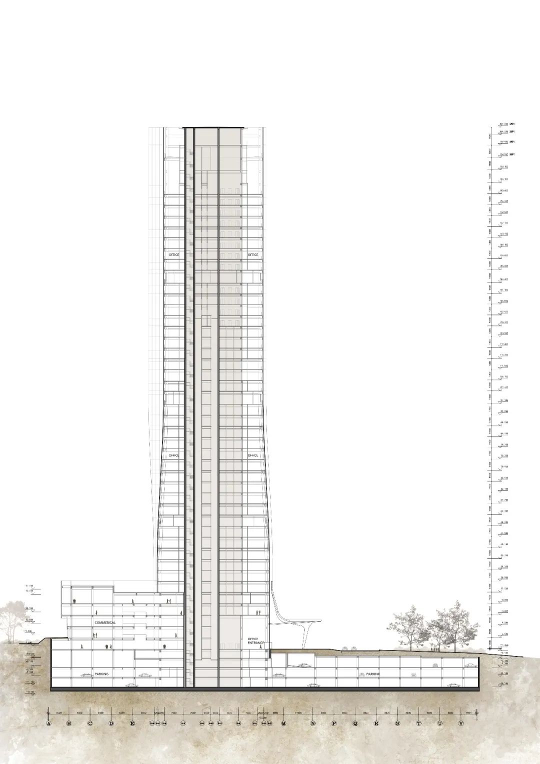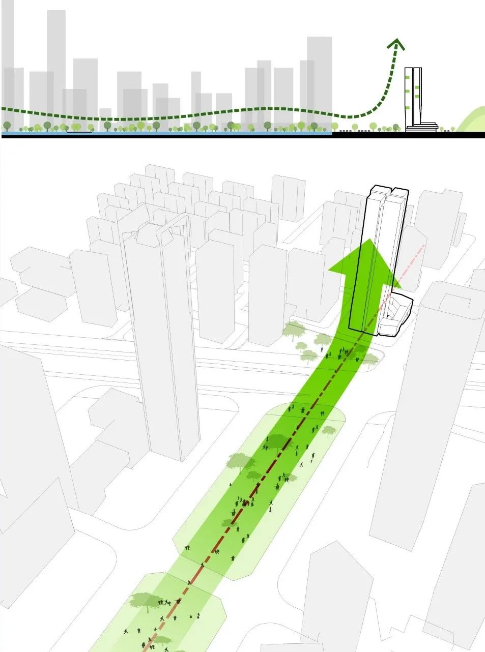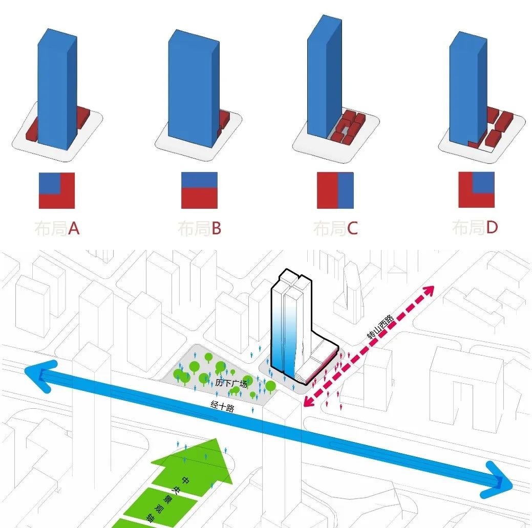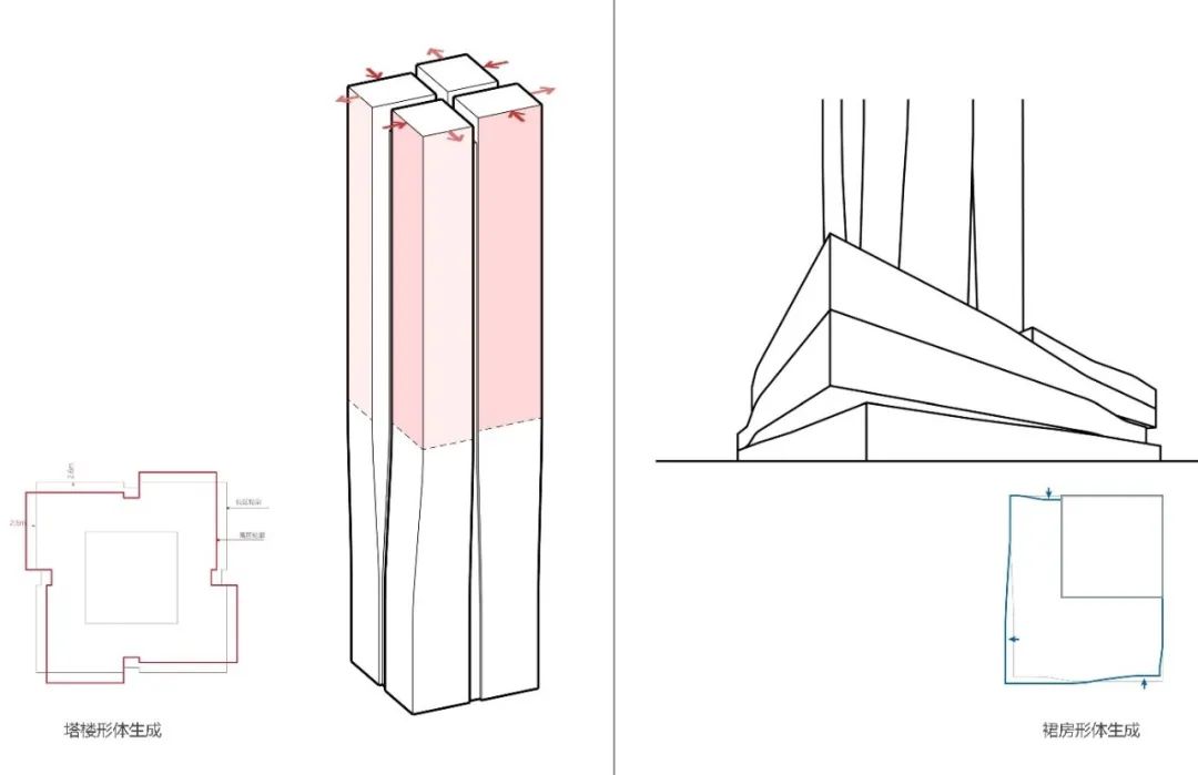 这座建筑的设计辨识度来源于其对建筑平面的基本策略:如何在不破坏高层建筑“最佳标准效率”的前提下,通过适当的体块分割变化,谋求在复杂城市环境之中不同观赏角度的活跃性。