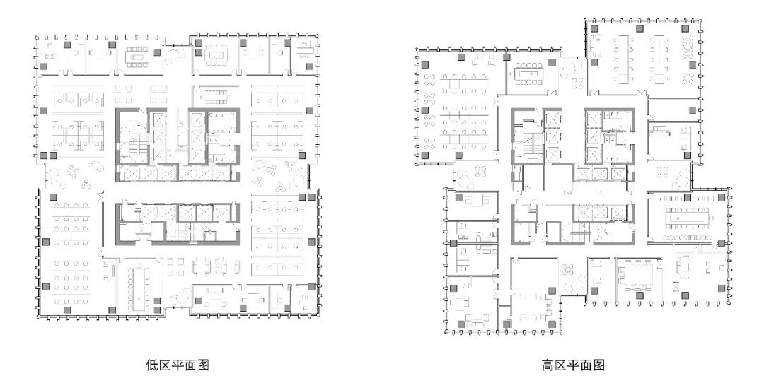 建筑以方形为母题,完美的正方形,明确的序列感,体现了稳重大气。开合的平面在建筑高区形成了“风车型”的布局形态,非常适合拓展平面使用功能在四个方向上的景观最大化。