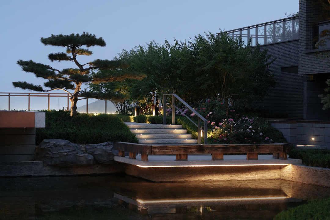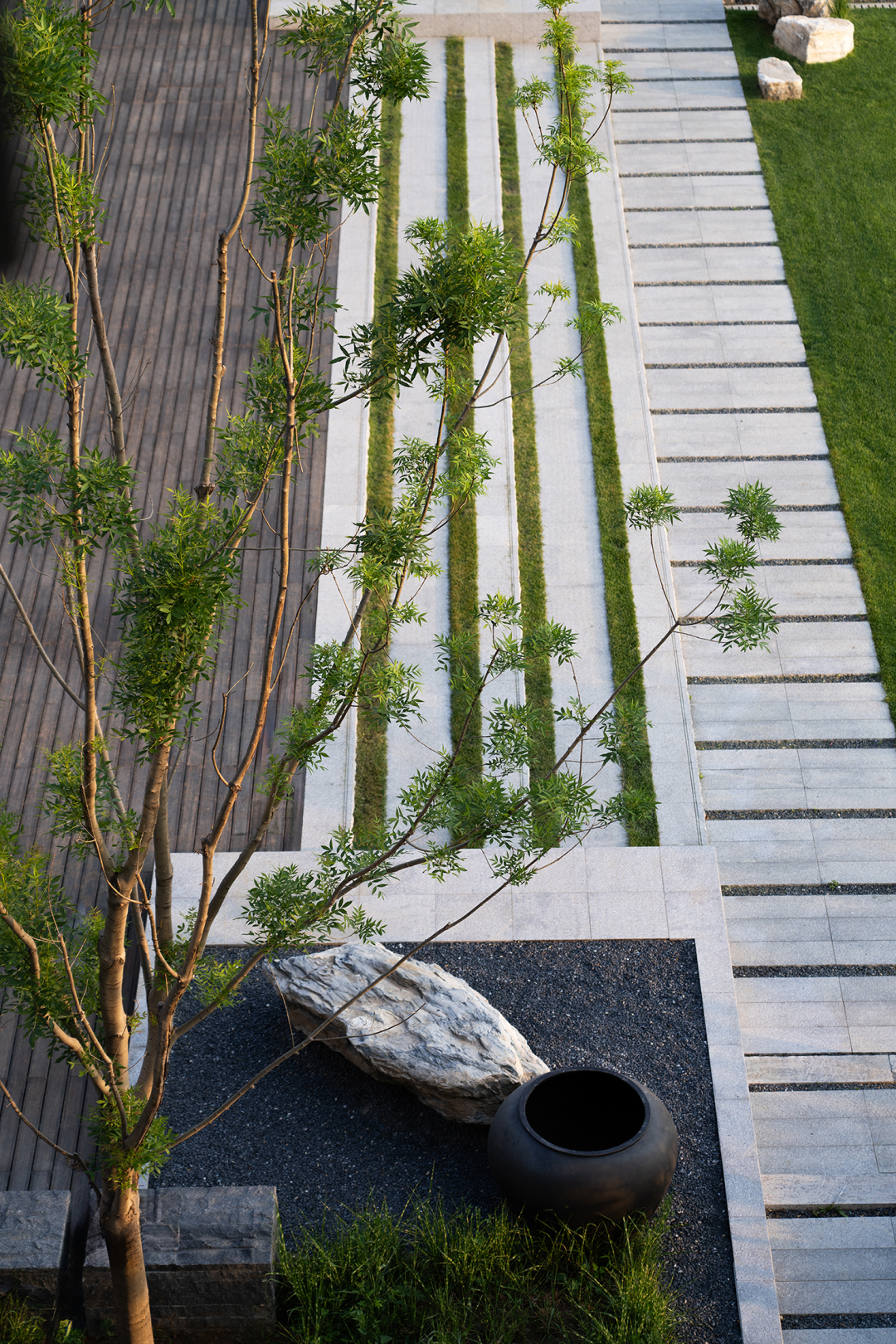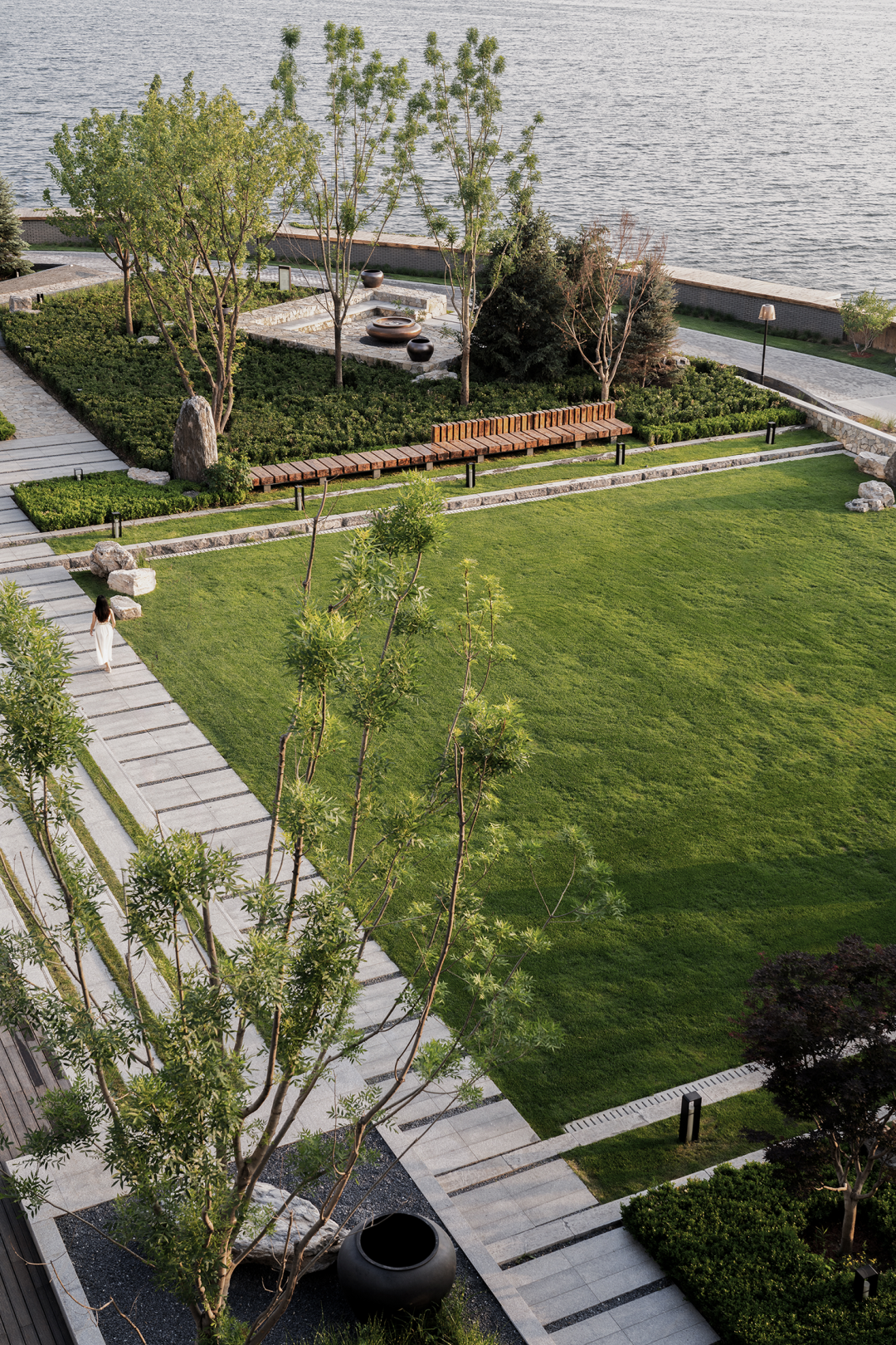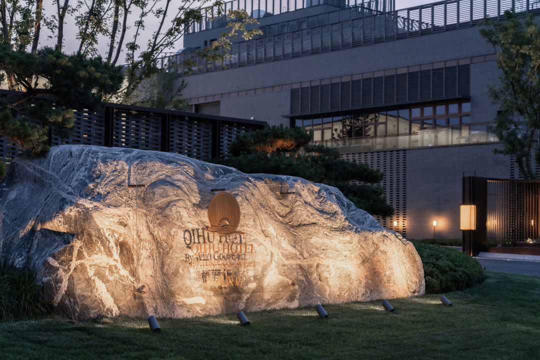 水纹肌理的泰山石,重重的屏风和墙,三五斜生的苍劲黑松,雕磨过的巨石,把酒店的主体建筑引现了出来,这便是迎接访客的车马院了。湖在哪里,似乎全然摸不着头脑。