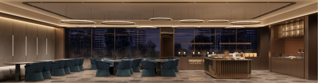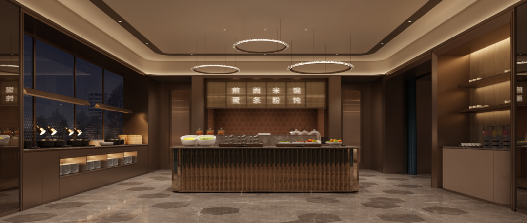 早餐厅设计的主旋律在于柔和的色调与线条的和谐交错。墙面以温暖的米色为基调,搭配木质元素,展现出一种亲切而又高雅的氛围。而那些镶嵌在天花板上的环形吊灯,轻盈如翼,如晨曦如曙光,营造出柔和而均衡的照明效果。