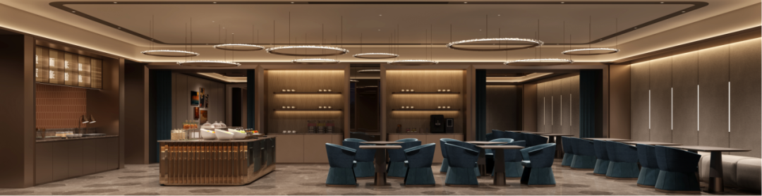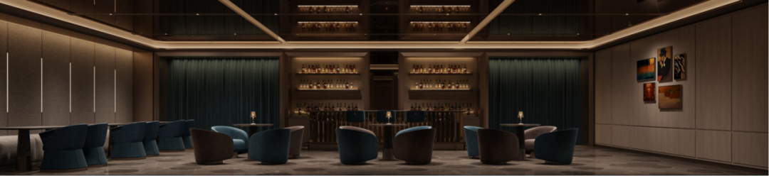 以全日餐饮和行政酒廊的概念打造全日餐厅及酒吧。通过巧妙的空间分隔,区域能够在不同的时段灵活切换使用场景,是水晶空间设计的创新亮点,不仅实现了多功能的用餐与社交空间,也创造了水晶独特的微醺酒吧体验。