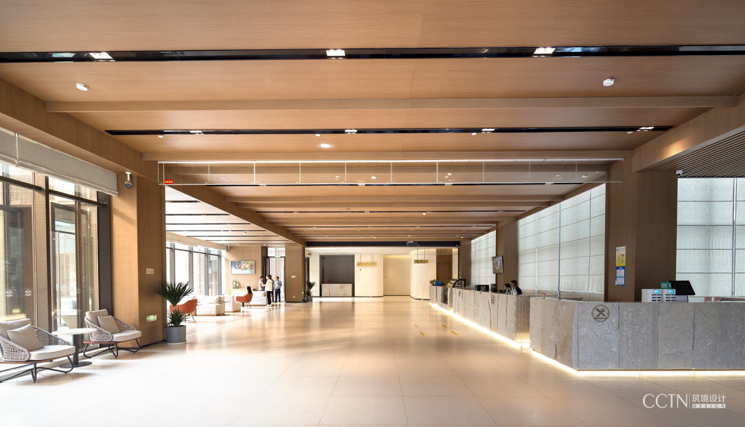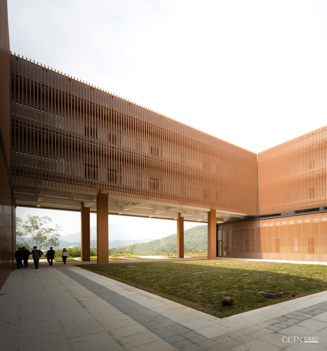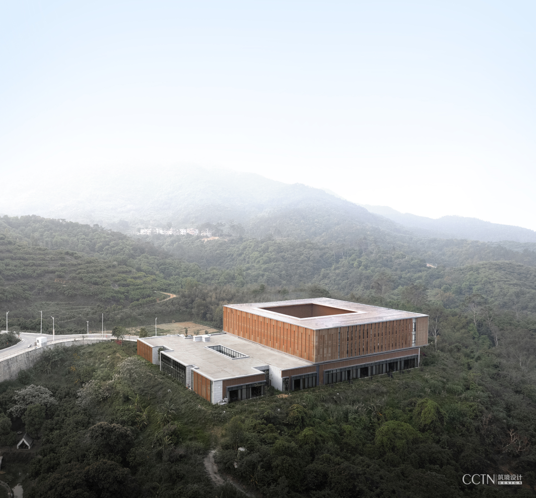 地块原始地形为一个山头,区域制高点。建筑将各功能区在垂直维度布局,充分利用地形特点, 使不同功能区都能获得良好的景观视线。建筑首层布置了大堂、全日餐厅、健身等公共功能,通过两个内庭院串接了起来。2到5层是客房区域,设计从闽南地域文化中获得灵感,以悬浮的土楼为设计构想,将客房整合成方形体量,悬浮于首层之上,一览四周的山景。建筑外立面覆盖了富有当地特色的图案木色格栅,从外部看建筑体量更为整体,同时也为室内景观蒙上了一层艺术化的滤镜。