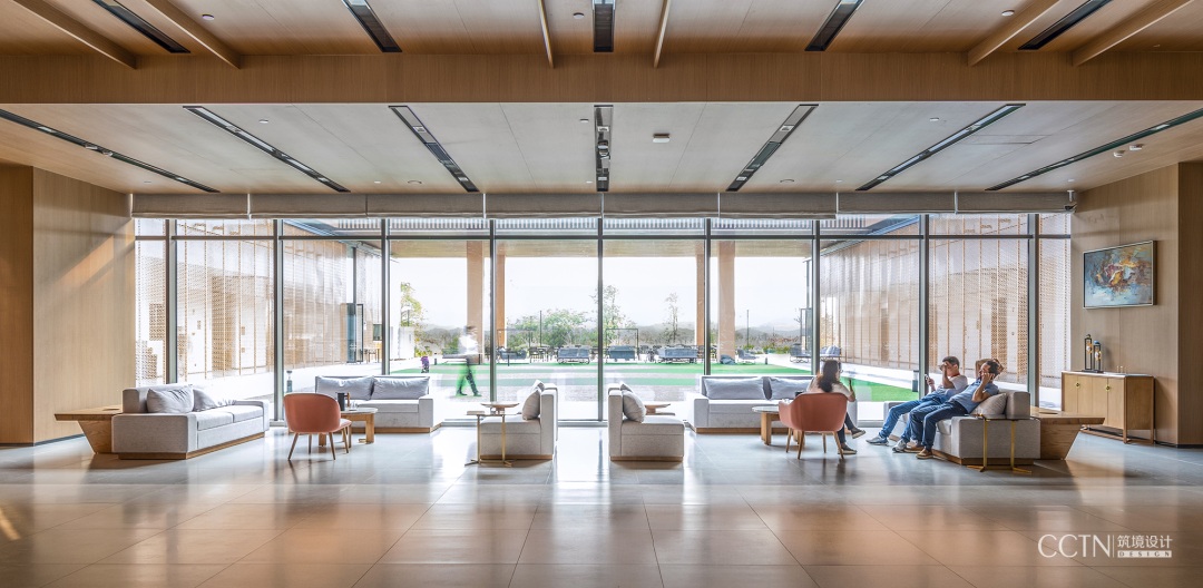 地块原始地形为伸出山体的坡地,南向有开阔的水库景观,地块内两栋多层建筑朝向湖面呈“L”型布局,最大化利用景观资源,在靠近湖面一侧,我们设置了一排低层的别墅式客房,与后排多层客房视线错开,且每间客房自带内庭院,同时拥有近距离的湖景资源。在多层客房与低层客房之间我们还设计了内花园,外部的湖景可以通过客房聚落的间隙渗透进入,延伸至多层客房下部的架空层。