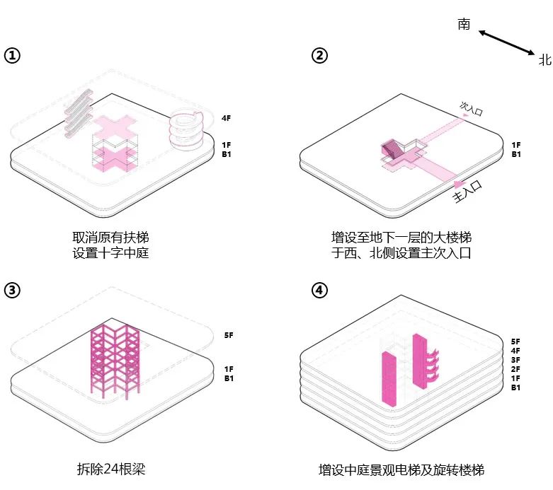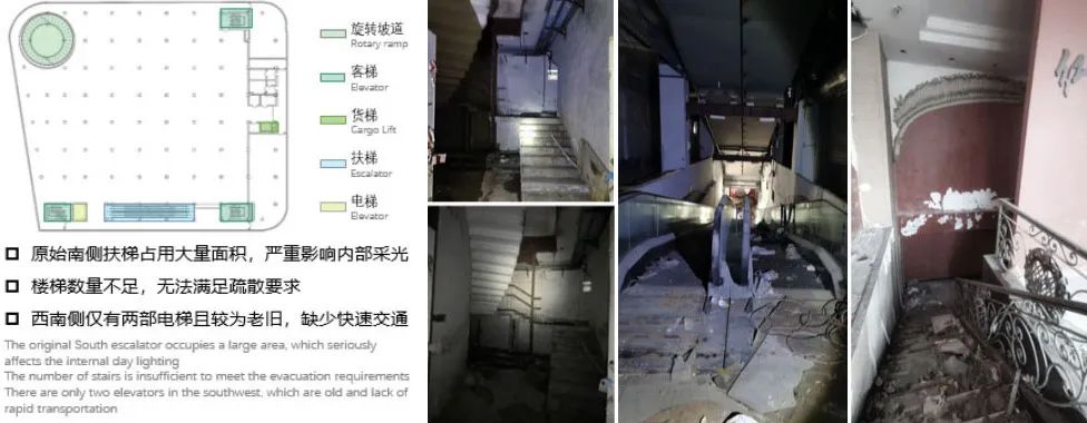 建筑主体改造后作为办公建筑对于采光要求较高。但既有建筑内部进深较大,边缘向内心采光强度逐渐减弱,空间价值越来越低,对于未来入驻的办公人员来说,改造前的建筑平面功能均无法满足日常工作与休闲要求。