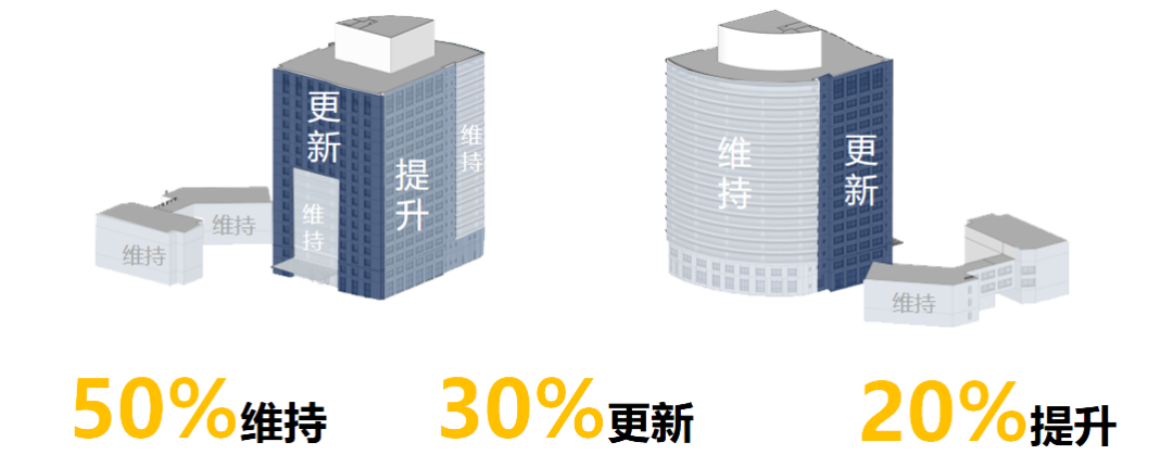 为了解决这一问题,J&A提出“50%维持,30%更新,20%提升”的具体做法,将原有老旧的窗墙更新为现代感的大体量幕墙设计,以一种简洁的秩序重新统一建筑外观。