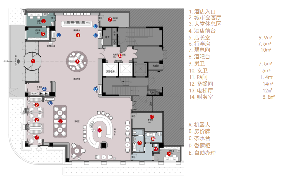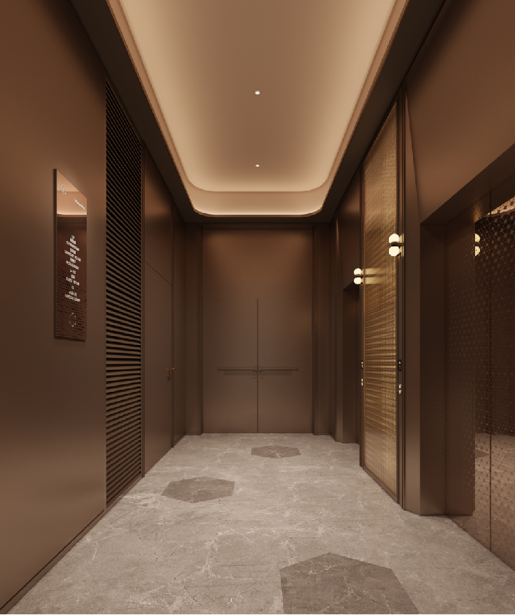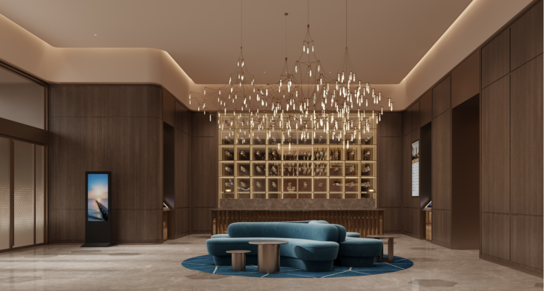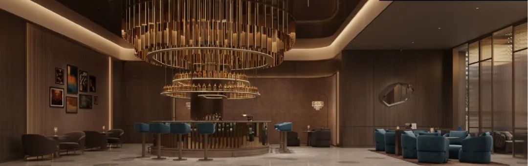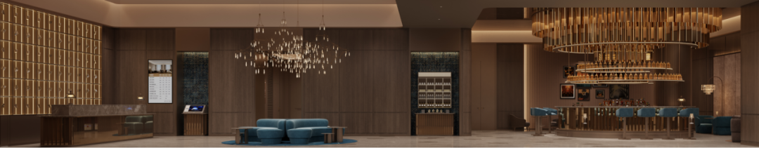 深棕色赋予大堂沉稳底蕴勾勒出历久弥新的水晶氛围,错落垂坠的吊灯让这里充满了灵动。一旁的开放式大堂吧经过香氛展示区自然过渡,加入朋克的金素元素,不羁而个性。